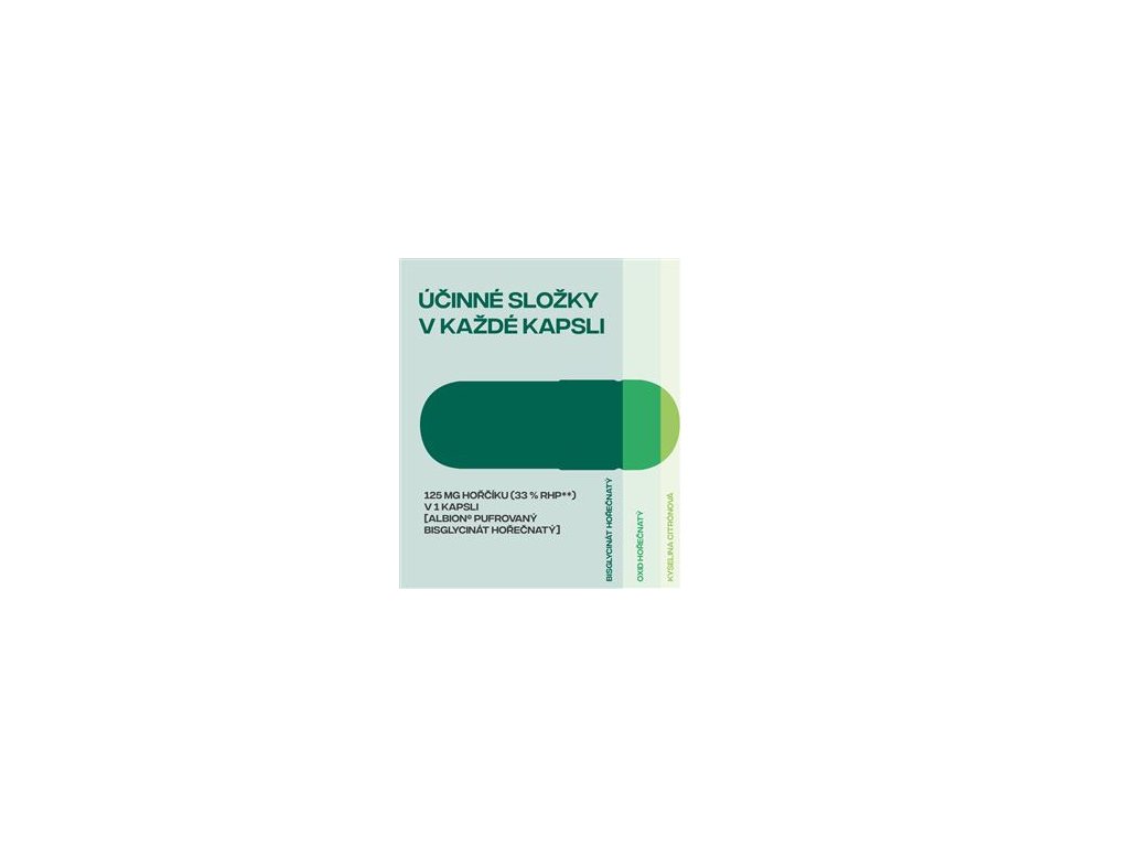 Složení v 1 želatinové* kapsli: 125 mg hořčíku (33 % RHP**) [Albion® pufrovaný bisglycinát hořečnatý (bisglycinát hořečnatý, oxid hořečnatý, kyselina citronová)], želatinová kapsle (hovězí želatina*, barvivo oxidy a hydroxidy železa), plnidlo maltodextrin, protispékavé látky (stearan hořečnatý, dioxid křemičitý). *nevhodné pro vegetariány. **% RHP - % referenční hodnoty příjmu.