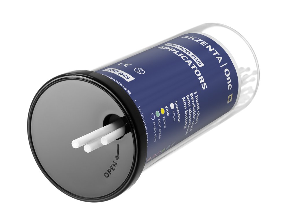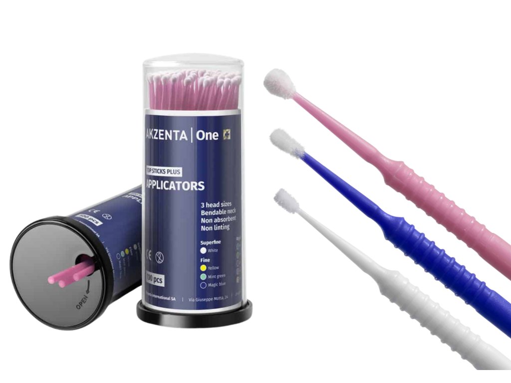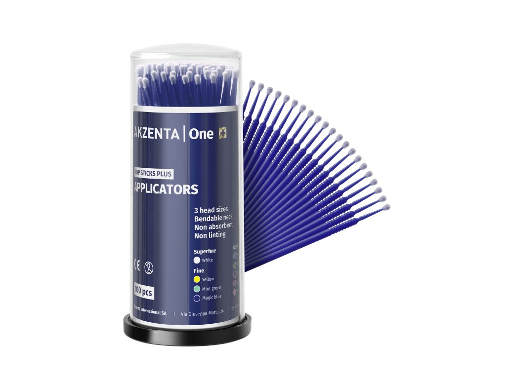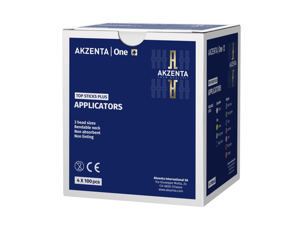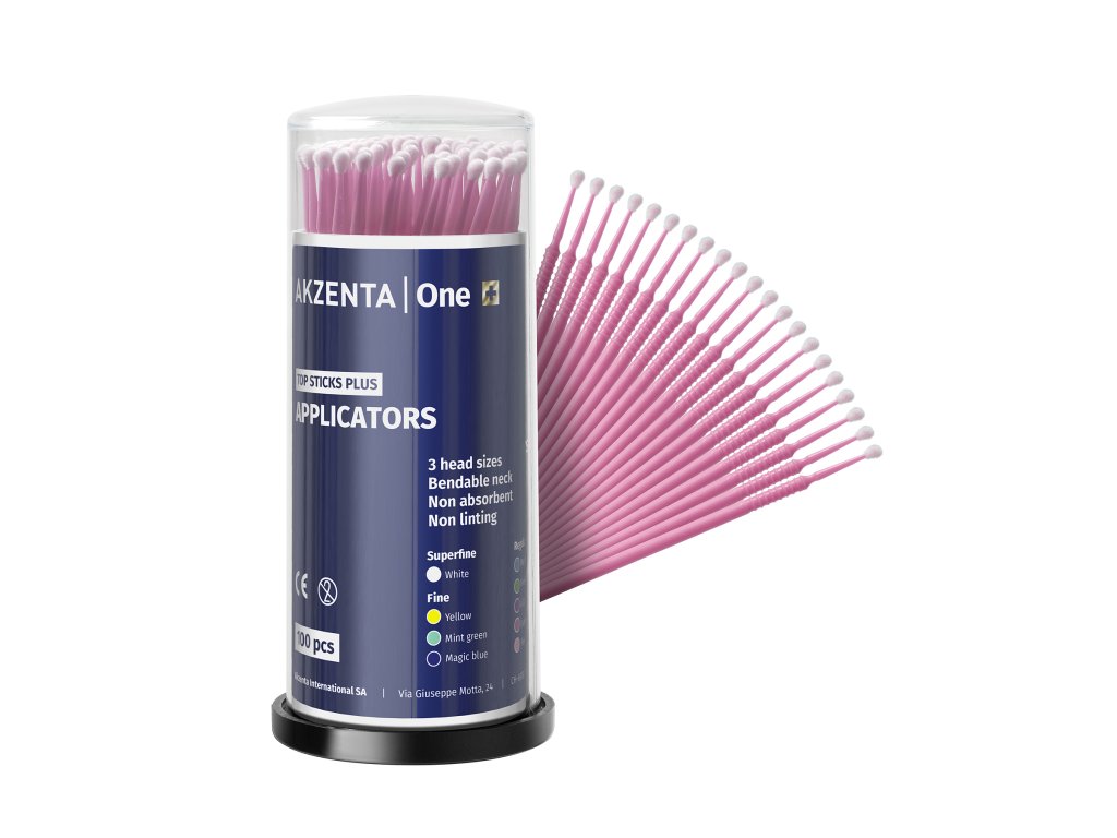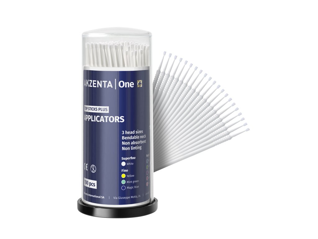 Mikroaplikátory TOP STICKS PLUS od AKZENTA jsou navrženy pro maximální ergonomii a přesnost při dentálních zákrocích. Díky ohebnému krčku, který lze snadno ohnout do požadovaného tvaru, je zajištěna snadná manipulace a precizní aplikace materiálů i v těžko přístupných oblastech. Měkké hlavice jsou vysoce savé a neulpívají na zubech, což zajišťuje efektivní aplikaci bez nežádoucího strhávání materiálu. Je důležité tyto mikroaplikátory nepoužívat dlouhodobě, aby se předešlo možnému uvolnění vláken, a vyhnout se jejich použití s činidly obsahujícími butanon kvůli riziku chemických reakcí. Balení obsahuje 4 zásobníky po 100 ks, celkem 400 mikroaplikátorů, rozdělených podle velikostí a barev pro rychlou orientaci.