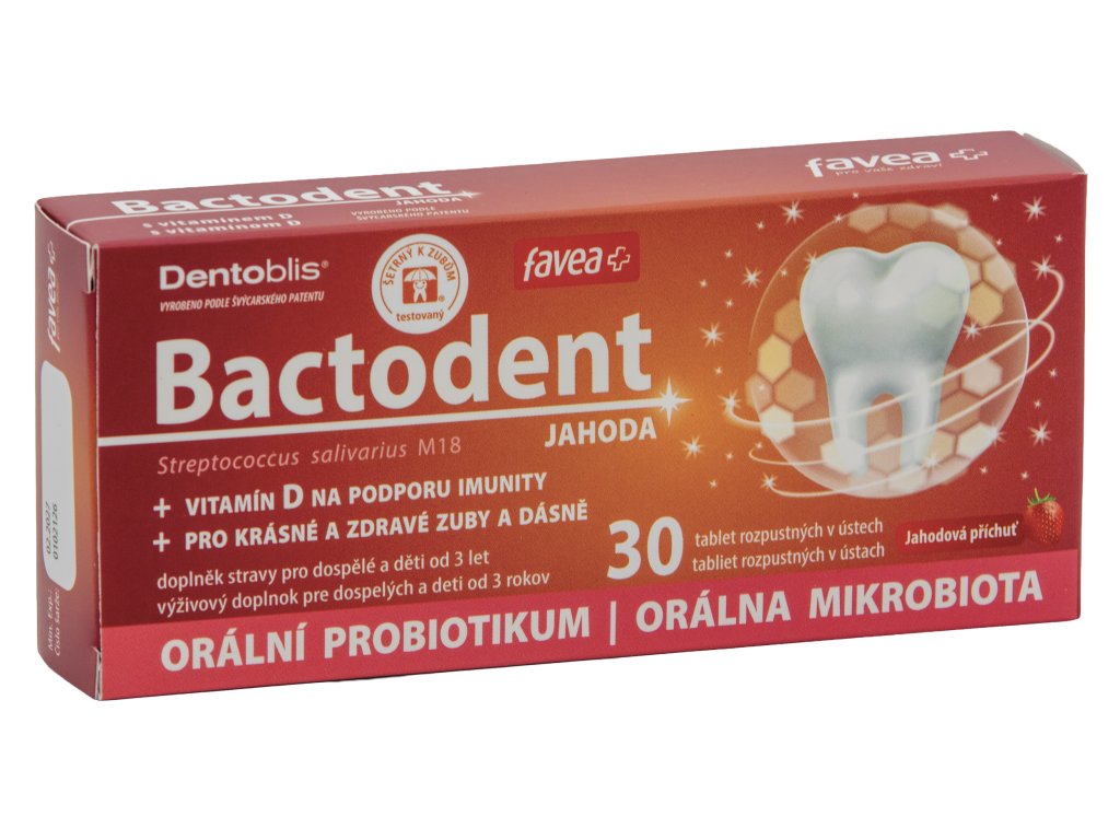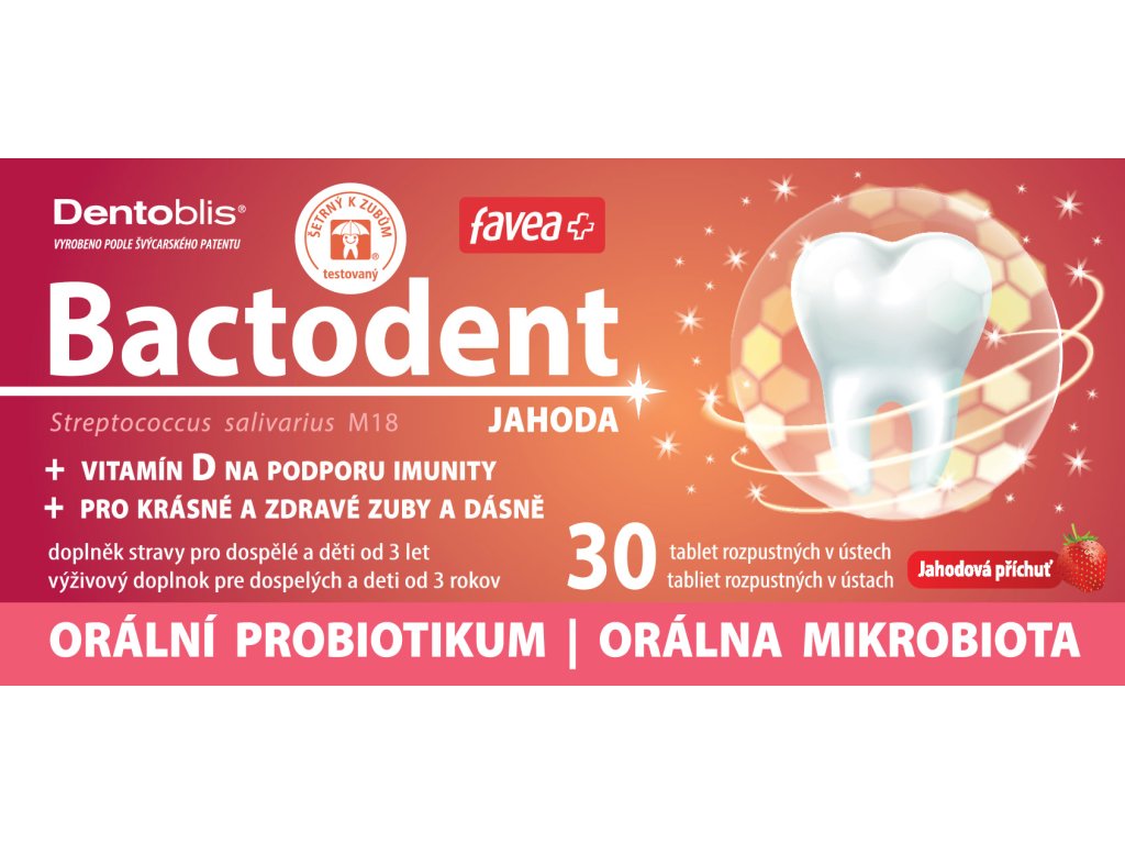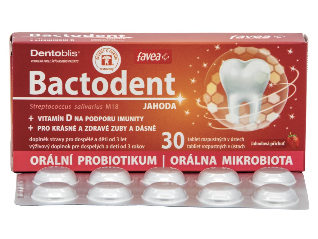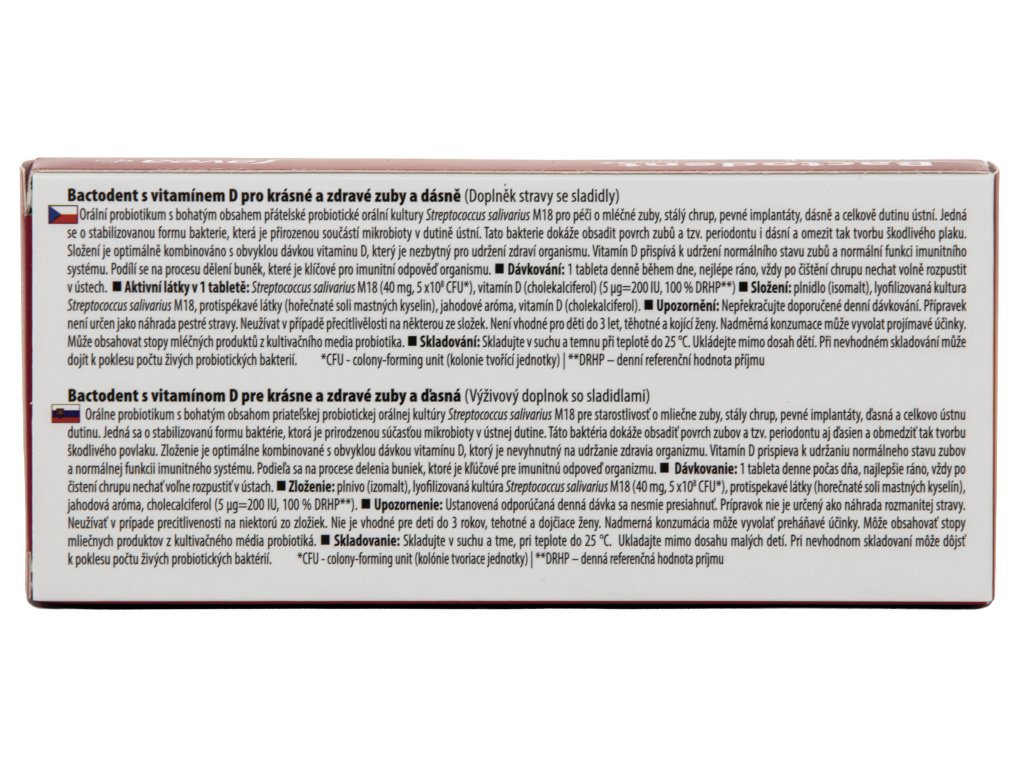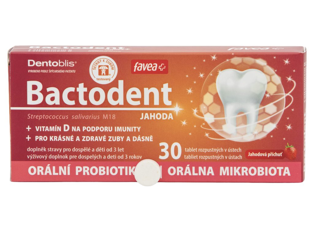 Složení: plnidlo (isomalt), lyofilizovaná kultura Streptococcus salivarius M18, protispékavé látky (hořečnaté soli mastných kyselin), jahodové aróma, vitamín D (cholekalciferol).
