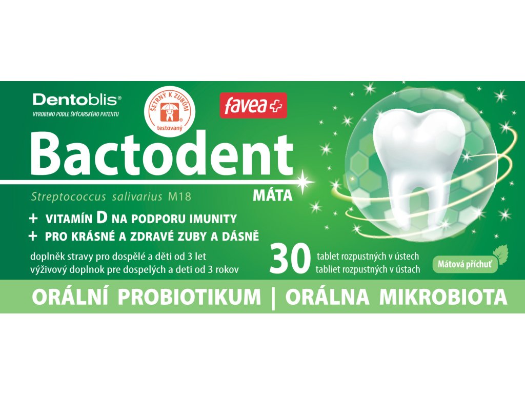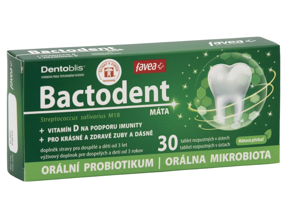 Orální probiotikum s bohatým obsahem přátelské probiotické orální kultury Streptococcus salivarius M18 pro péči o mléčné zuby, stálý chrup, pevné implantáty a celkově dutinu ústní.