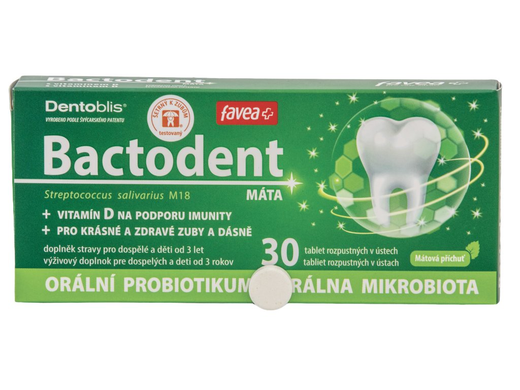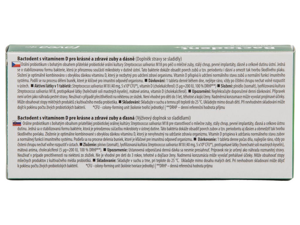 Složení: plnidlo (isomalt), lyofilizovaná kultura Streptococcus salivarius M18, protispékavé látky (hořečnaté soli mastných kyselin), mátové aróma, vitamín D (cholekalciferol).