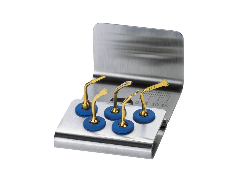 Sada obsahuje pět precizně zpracovaných koncovek: OT2, OT7, OP1, OP3 a EX1, které pokrývají široké spektrum indikací. Uloženy jsou v pevném nerezovém zásobníku, který zajišťuje správné uložení nástrojů a umožňuje jejich bezpečnou sterilizaci v autoklávu. Kompatibilní se všemi přístroji PIEZOSURGERY® od Mectron.