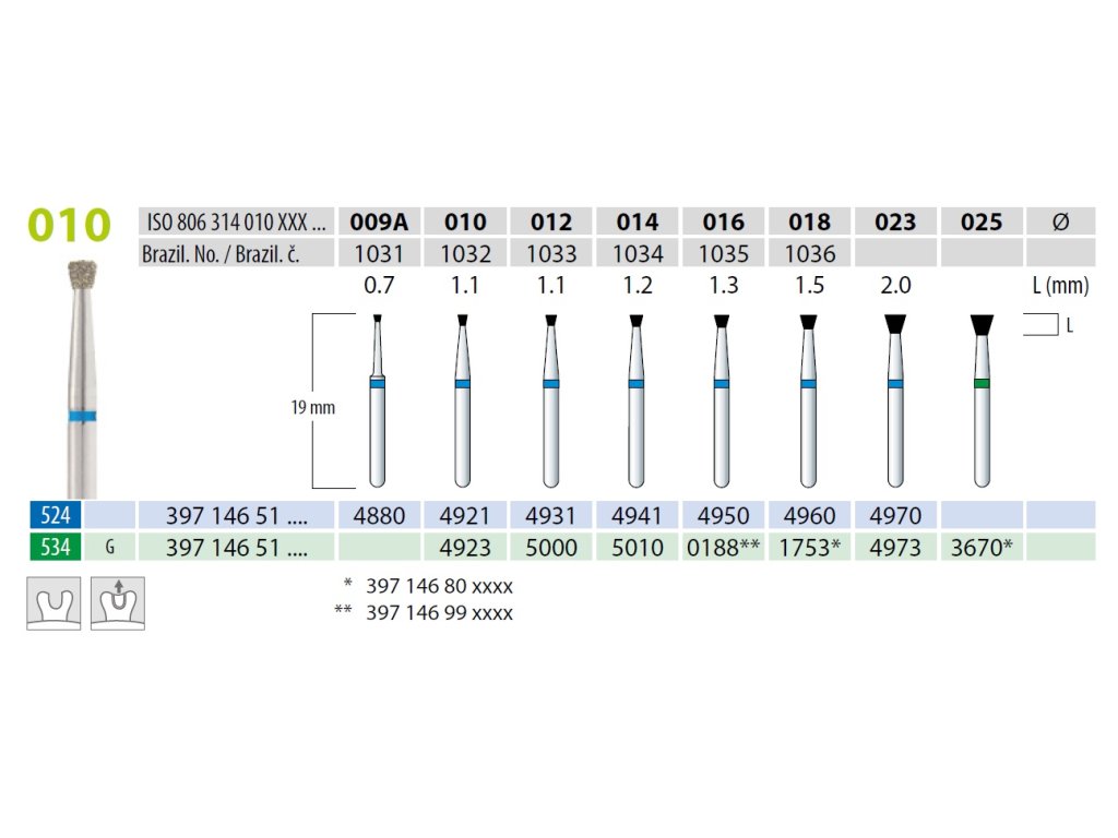 Tento diamantovaný brousek je součástí řady 806.314.010.524.xxx. Kód „524“ označuje konkrétní tvar pracovní části, zatímco prostřední číselná řada „010“ značí jinou délku nebo konstrukční variantu oproti sériím „001“ či „002“, přičemž je zachován typ stopky (FG). Koncovka „012“ udává malý průměr pracovní části, což je oproti velikosti 010 mírně větší, ale stále velmi jemný nástroj.