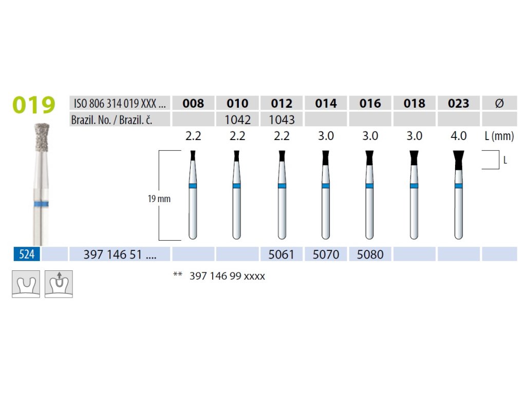 Tento diamantovaný brousek je součástí řady 806.314.019.524.xxx. Kód „524“ označuje konkrétní tvar pracovní části, zatímco prostřední číselná řada „019“ značí odlišnou délku nebo konstrukční variantu oproti jiným řadám, jako jsou „001“, „002“ nebo „010“, přičemž je zachován typ stopky (FG) pro turbinový násadec. Koncovka „016“ udává stále malý, ale již výrazně univerzálnější průměr pracovní části, větší než 010 a 014, což je vhodné pro přesné, ale i mírně plošnější dokončovací práce.