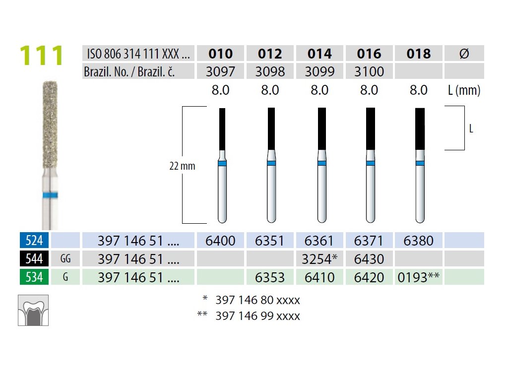Tento diamantovaný brousek patří do řady 806.314.111.524.xxx a je určen pro jemné finišování v konzervační stomatologii. Kód „524" označuje tvar a geometrii hlavičky shodnou s ostatními brousky 524, tedy stejný profil pracovní části, kde se liší pouze průměr a délka – jedná se o univerzální dokončovací tvar. Číselná řada „111" značí konkrétní délkovou a konstrukční variantu se stopkou FG pro turbinový (vysokootáčkový) násadec, obdobně jako varianty 108, 109 nebo 110, ale s vlastní délkou aktivní části. Koncovka „012" udává malý průměr pracovní části, což činí tento nástroj štíhlým a extra jemným, o něco robustnější než velikost 010, vhodný pro detailní dokončovací práce v užších oblastech.