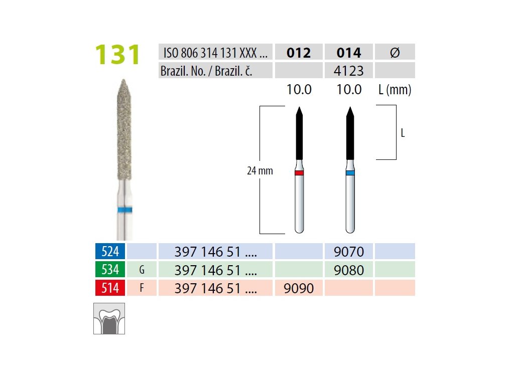 Tento diamantovaný brousek patří do řady 806.314.131.534.xxx a je určen pro jemné finišování v konzervační stomatologii. Kód „534" označuje specifický dokončovací tvar hlavičky, jiný profil než varianty 514, 524 a 544 – volí se podle preferovaného tvaru a přístupu do preparace. Číselná řada „131" značí konkrétní délkovou a konstrukční variantu se stopkou FG pro turbinový (vysokootáčkový) násadec. Koncovka „014" udává menší průměr pracovní části, což činí tento nástroj štíhlým, ale robustnějším než velikosti 010 a 012, vhodným pro detailní, ale již mírně plošnější dokončovací práce.