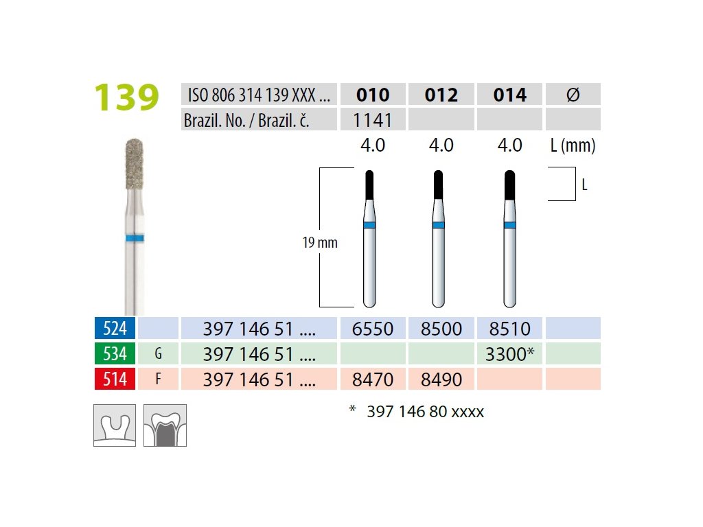 Tento diamantovaný brousek patří do řady 806.314.139.524.xxx a je určen pro jemné finišování v konzervační stomatologii. Kód „524" označuje univerzální dokončovací tvar hlavičky, vhodný pro běžné finišovací práce. Číselná řada „139" značí specifickou délkovou a konstrukční variantu se stopkou FG pro turbinový (vysokootáčkový) násadec. Koncovka „012" udává menší průměr pracovní části, což činí tento nástroj štíhlým a vhodným pro detailní dokončovací práce, které vyžadují přesnost a jemnost.