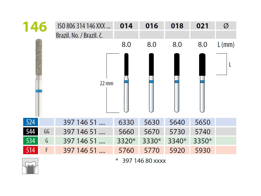 Tento diamantovaný brousek patří do řady 806.314.146.514.xxx a je určen pro jemné finišování v konzervační stomatologii. Kód „514" označuje specifický dokončovací tvar hlavičky, který je vhodný pro detailní finišovací práce. Číselná řada „146" značí specifickou délkovou a konstrukční variantu, která může zahrnovat odlišnou velikost nebo tvar stopky, případně jinou kompatibilitu s nástroji. Koncovka „016" udává průměr pracovní části, což poskytuje robustnější nástroj vhodný pro detailní i mírně plošnější dokončovací práce.