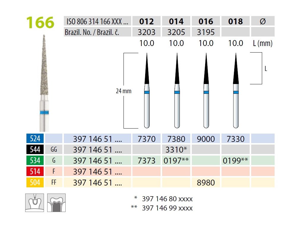 Tento diamantovaný brousek je určen pro jemné dokončovací práce v oblasti stomatologie. Patří do řady 806.314.166.524.xxx, kde: