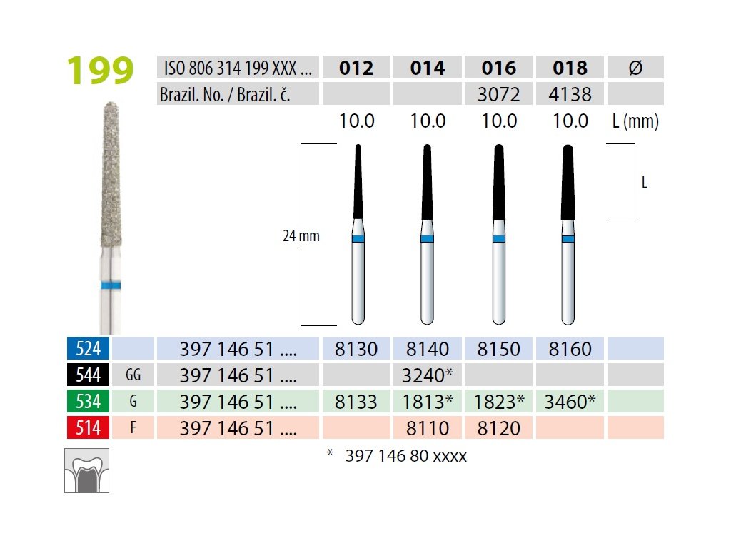 - Číselná řada „199" značí variantu délky a konstrukce, která ovlivňuje kompatibilitu s různými stomatologickými nástroji.
