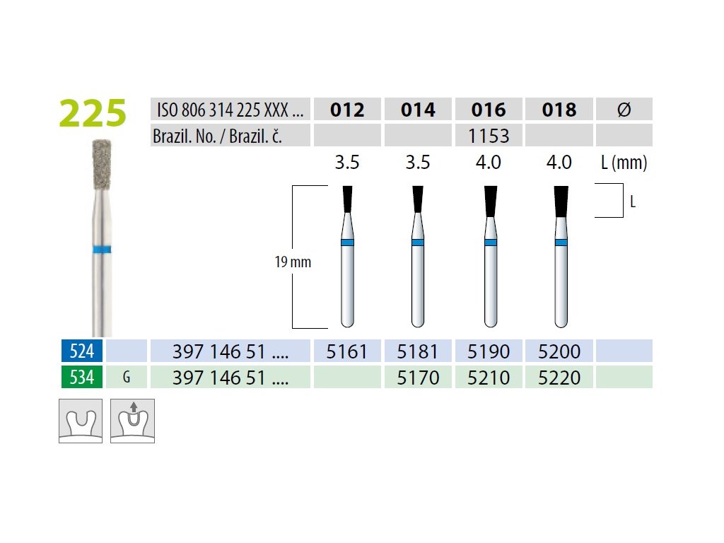 - Číselná řada „225" značí variantu délky a konstrukce, která ovlivňuje kompatibilitu s různými stomatologickými nástroji.
