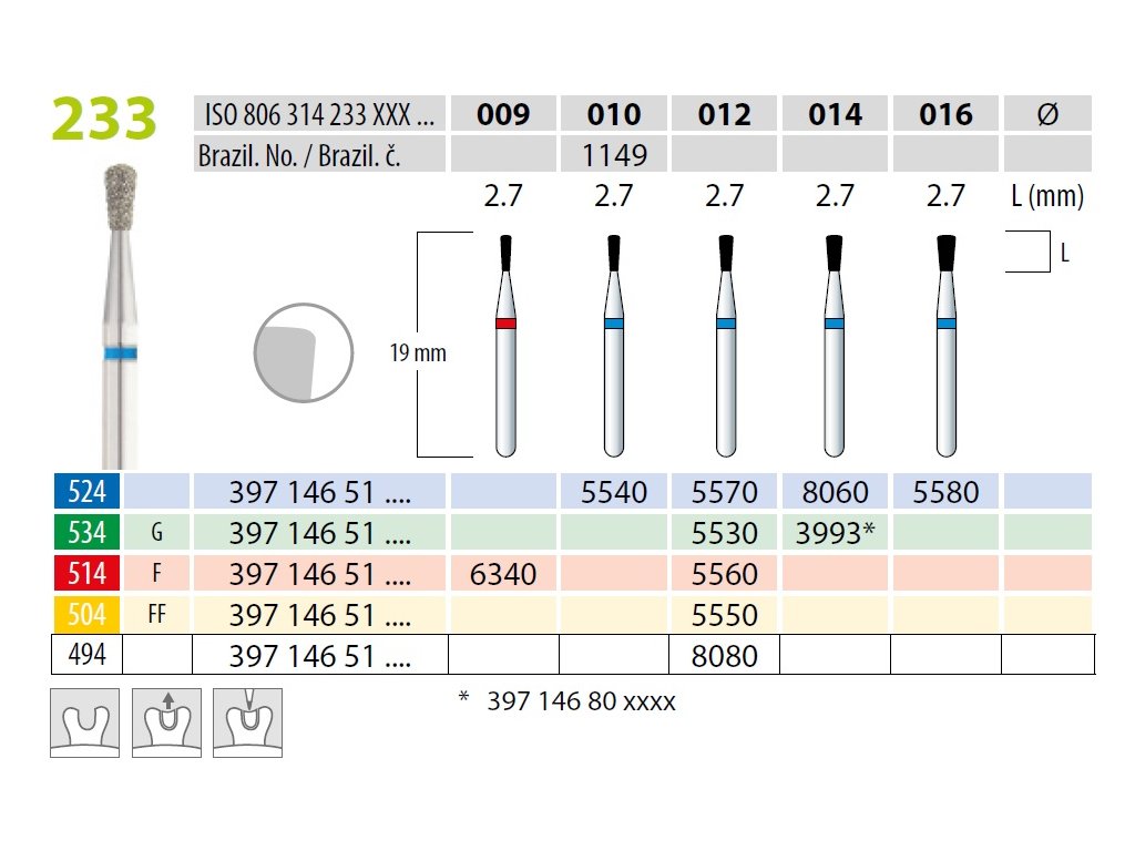 - Číselná řada „233" značí variantu délky a konstrukce, která ovlivňuje kompatibilitu s různými stomatologickými nástroji.