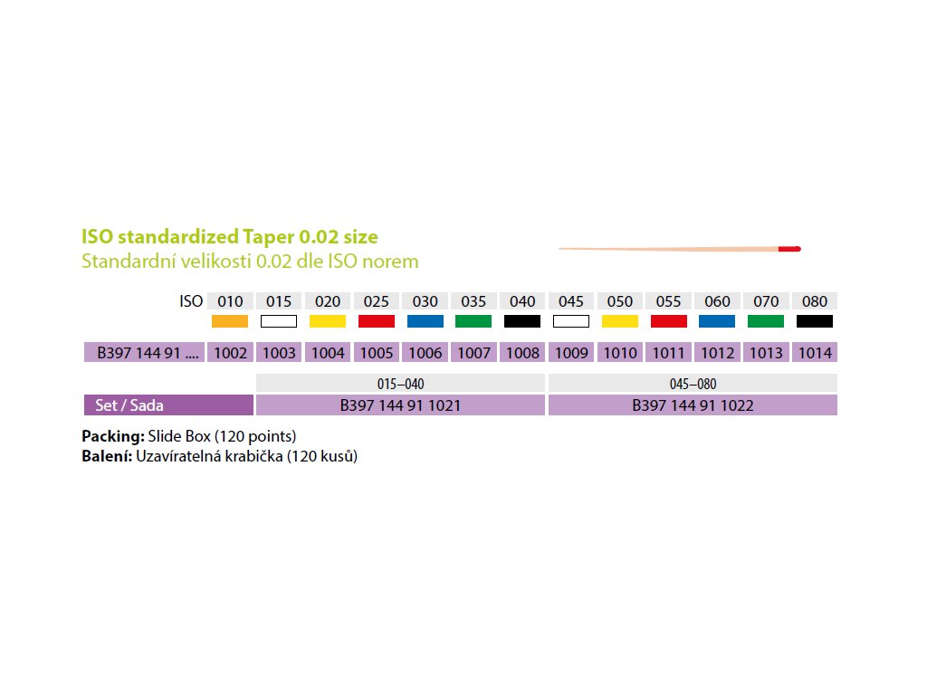 - Použití: plnění kořenových kanálků ISO 45, hlavní i doplňkové čepy