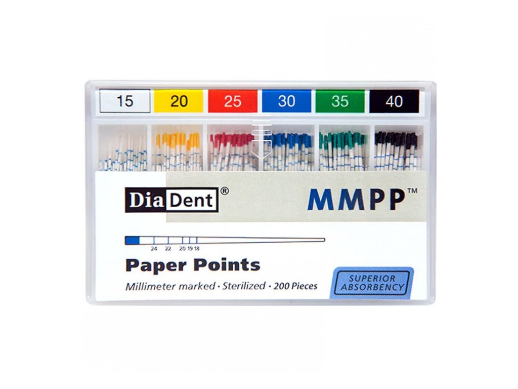 Vysoce kvalitní papírové čepy ISO 20 s konicitou .02 představují základní pomůcku při endodontickém ošetření. Jsou určeny k preciznímu sušení kořenových kanálků před jejich zaplněním. Vyznačují se vysokou savostí, rovnoměrným tvarem a snadnou manipulací.