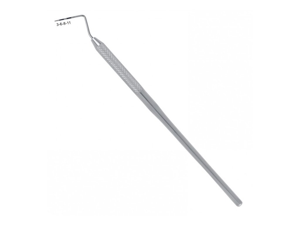 Sonda fig. 11 je standardním nástrojem pro stomatology při diagnostice parodontálních onemocnění, který umožňuje přesnou lokalizaci a dokumentaci hloubky chobotů. Barevné kódování odpovídá mezinárodním standardům WHO.