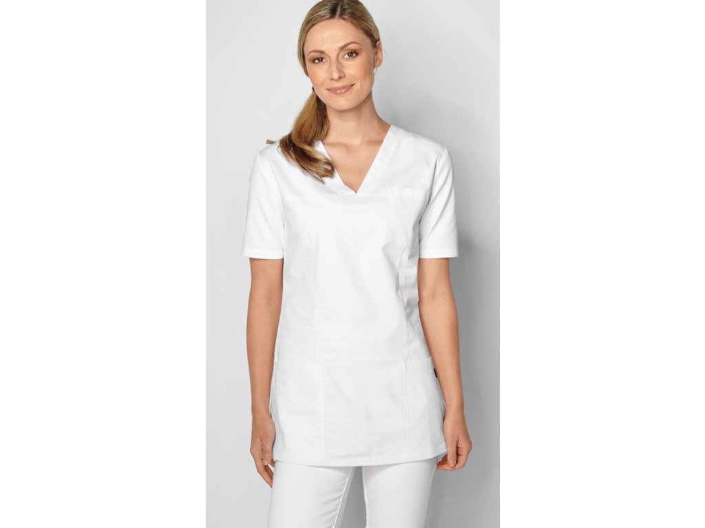 Dodání 4-5 pracovních dnů. Dámská halena s krátkým rukávem a výstřihem do V. Bílá tunika má dvě přední kapsy a jednu náprsní. Díky 100% podílu bavlny je příjemná, pohodlná i oblíbená pro svůj klasický střih. Velkou výhodou je praní v pračce až na 95°, je vhodná dokonce i do sušičky.