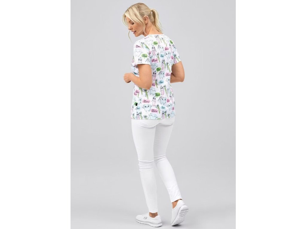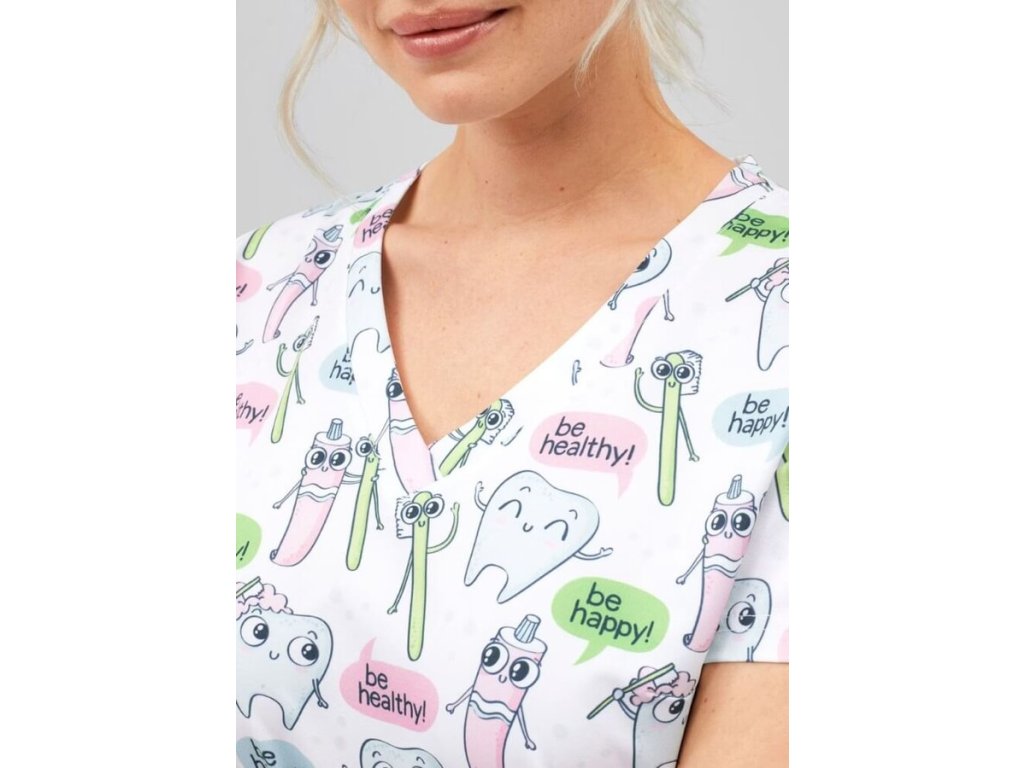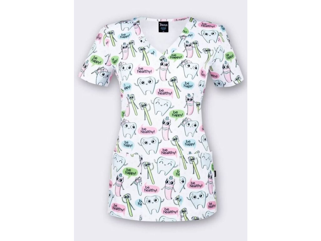Dodání 4-5 pracovních dnů. Dámská halena ZOUBKY je od značky 7days. Tunika má jemný, pastelový potisk zubů, zubních kartáčků a zubní pasty. Pracovní uniformu podtrhne kvalitní zpracování a jemný pružný materiál odvádějící vlhkost, který je na nošení pohodlný a příjemný. Oceníte dvě přední kapsy a hezky řešený V výstřih. Výhodou je RYCHLE SCHNOUCÍ a PRODYŠNÝ MATERIÁL.