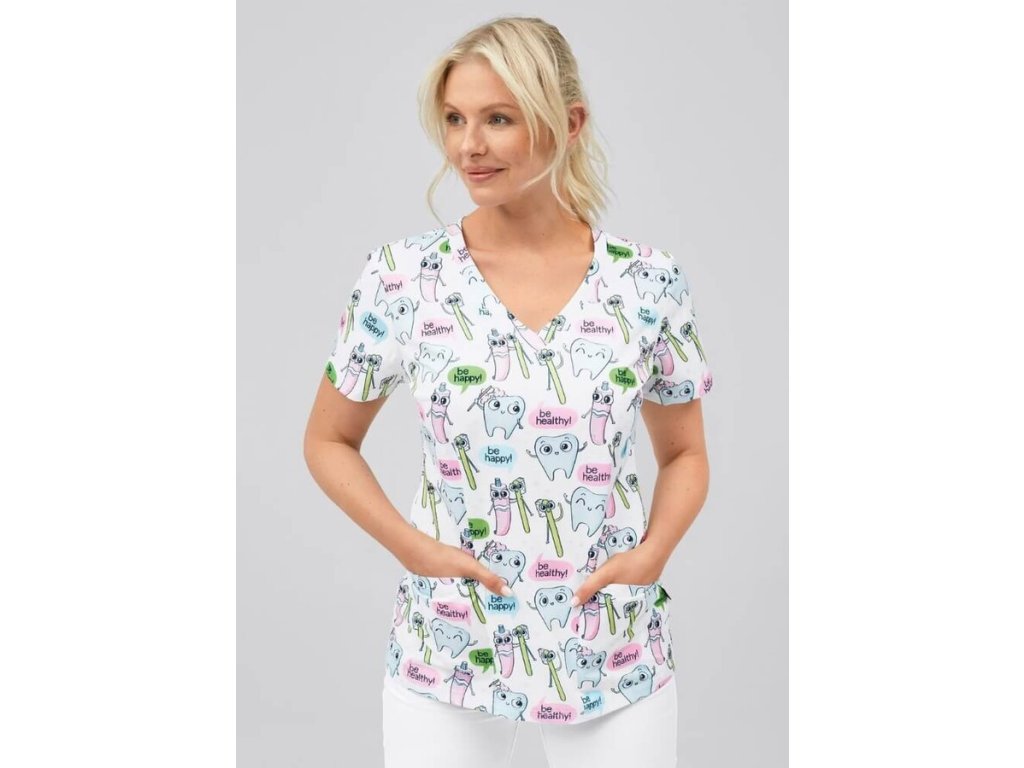Tato dámská zdravotnická halena je ideální volbou pro prostředí, kde se pracuje s dětmi, jako je zubní ordinace, dentální hygienistky, nebo pediatrický personál. Je vyrobena z kvalitního materiálu, který je rychleschnoucí, prodyšný a pohodlný, což zajišťuje komfort po celý pracovní den. Halena je navíc vysoce elastická díky 16% elastanu v materiálu, což poskytuje pohodlný a přizpůsobivý střih.