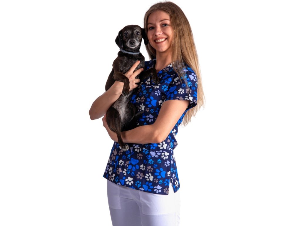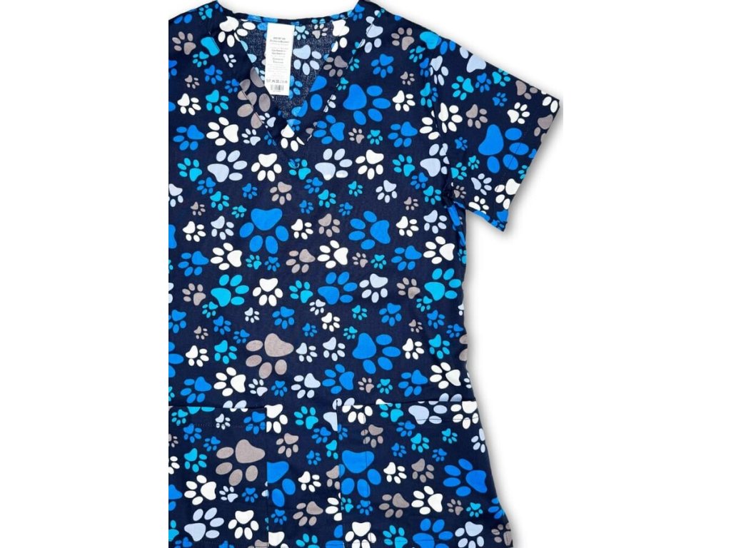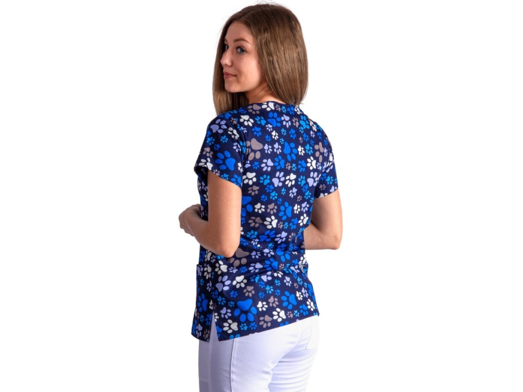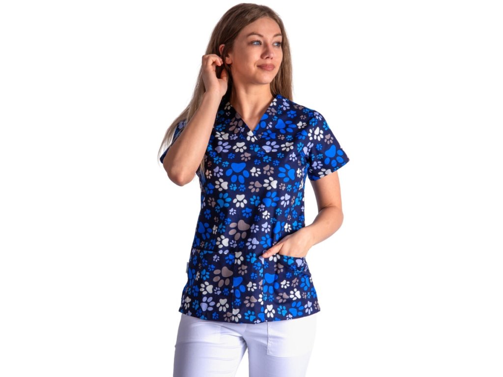 Dodání 4-5 pracovních dnů. Dámská halena TLAPKY Vás okouzlí svým roztomilým potiskem tlapek na tmavě modrém pokladu. Tunika má výstřih do V a krátké rukávy. Oceníte dvě přední kapsy, z nichž jedna má prošitý otvor pro tužku. Veselý potisk potěší Vaše pacienty a zpříjemní tak náladu na Vaší klinice. Pracovná uniforma kategórie BASIC.