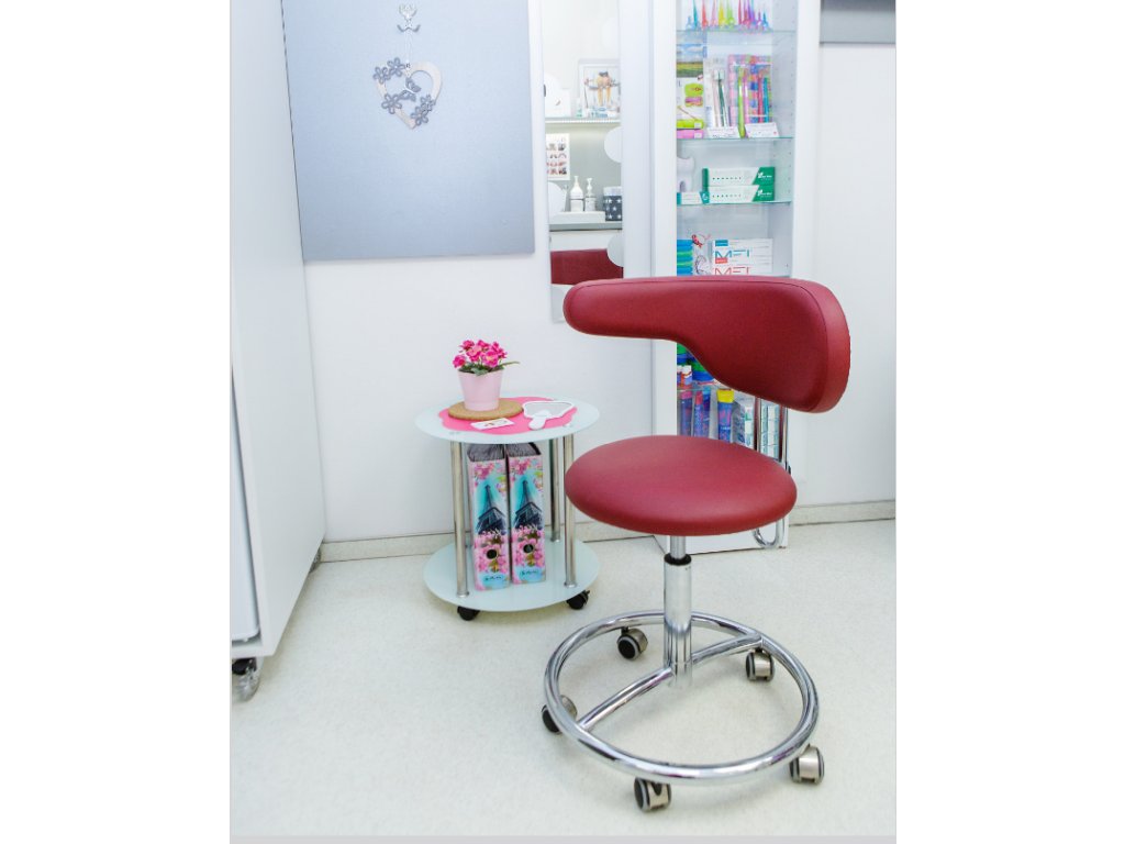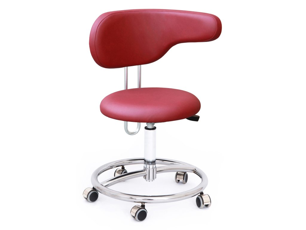 Dentální židle s pevnou chromovanou konstrukcí a kruhovou podnoží, výškově nastavitelná plynovým pístem, čalouněná ve zdravotní kožence, ideální pro stomatologické ordinace.