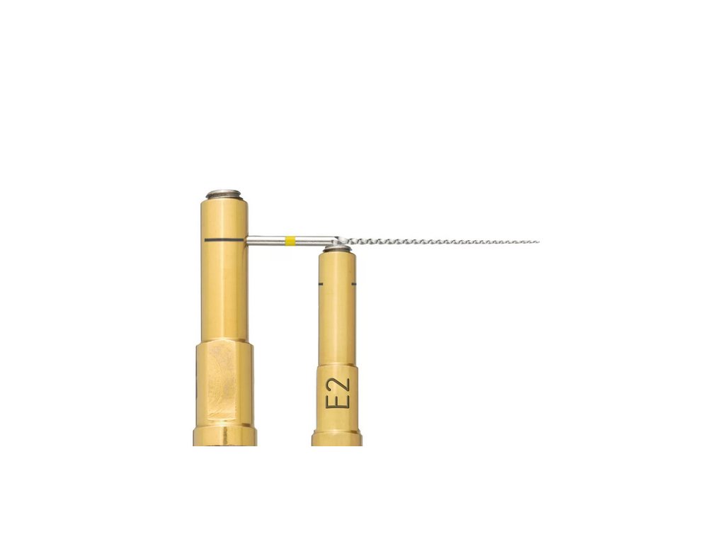 E2 – endo koncovka s 90° endochuckem pro montáž endodontických pilníků a nástrojů s průměrem dříku 0,8 mm. Povrch je opatřen povlakem z nitridu titanu pro vyšší odolnost, určena k ošetření stoliček.