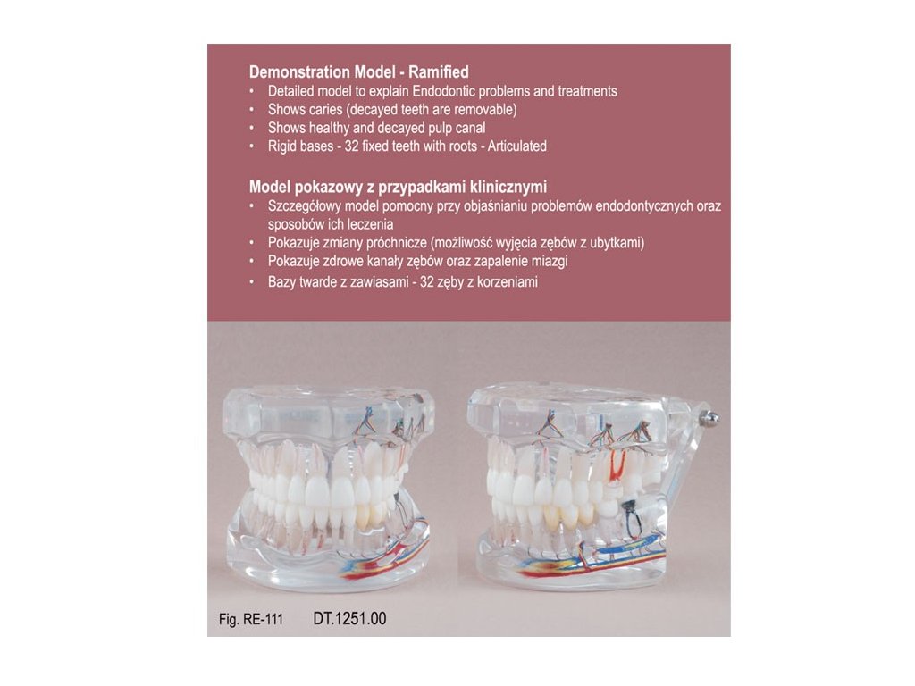 Díky průhledné konstrukci umožňuje názorně ukázat strukturu zubu, zubní kaz, zánět dřeně i průběh léčby.