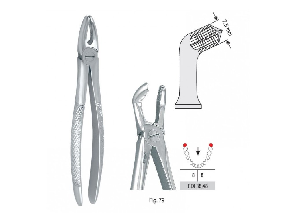 Kleště fig. 79 evropského typu jsou navrženy speciálně pro extrakci dolních zubů moudrosti (třetích molárů). Jejich tvar je uzpůsoben pro efektivní přístup k retinovaným nebo šikmo postaveným osmičkám. Robustní konstrukce a přesně profilované čelisti zajišťují pevné uchopení zubu bez jeho drcení.
