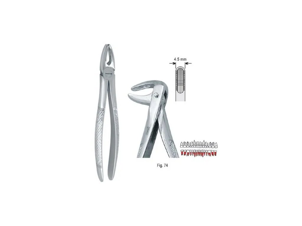 Extrakční kleště fig. 74 – evropský typ jsou určeny pro bezpečné a přesné vytržení zubu s maximální kontrolou a minimální námahou lékaře.