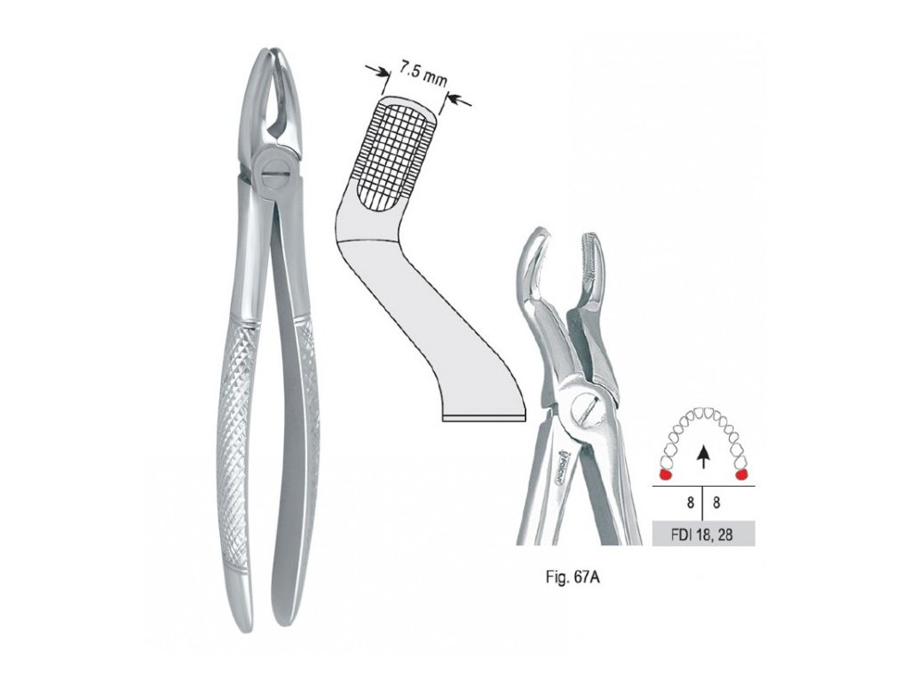 Model fig. 67A je přizpůsoben specifické morfologii horních třetích molárů, což umožňuje efektivní a šetrné vytažení bez přerušení kořenového systému.