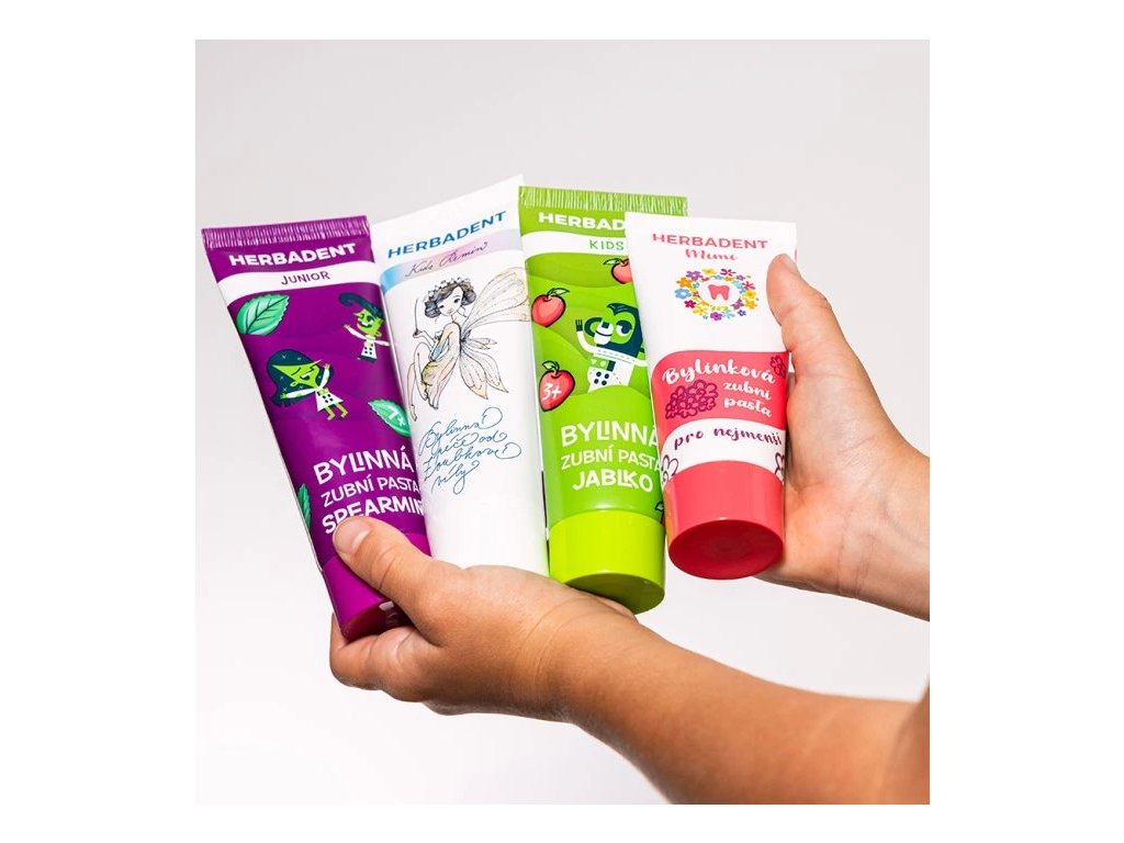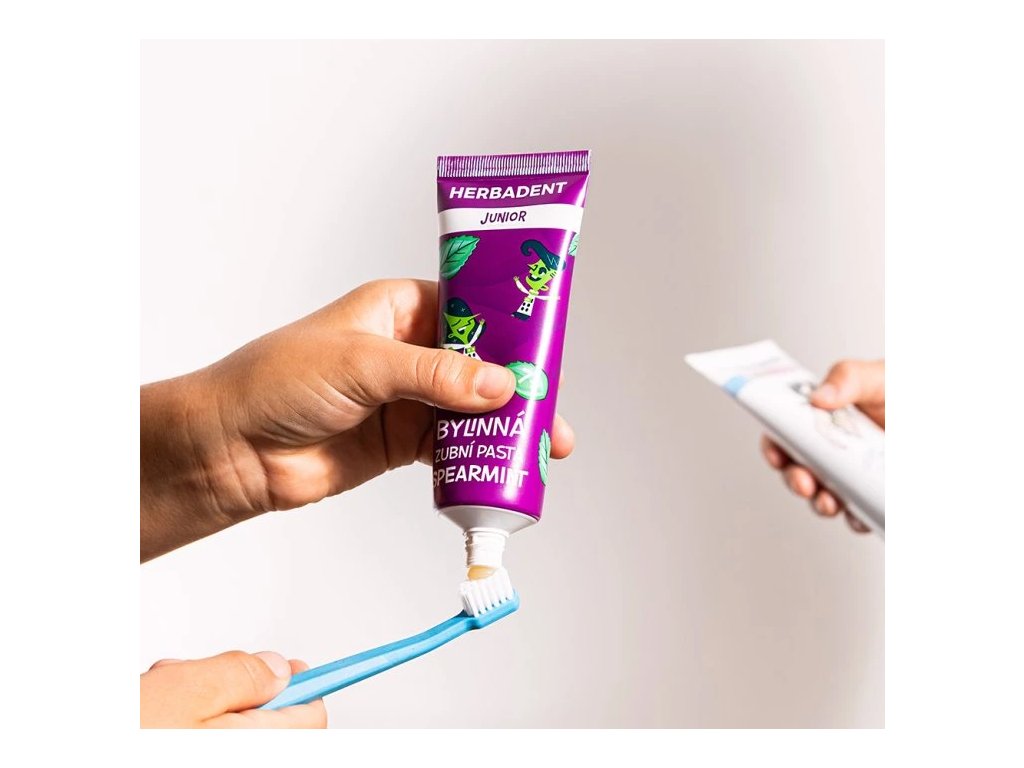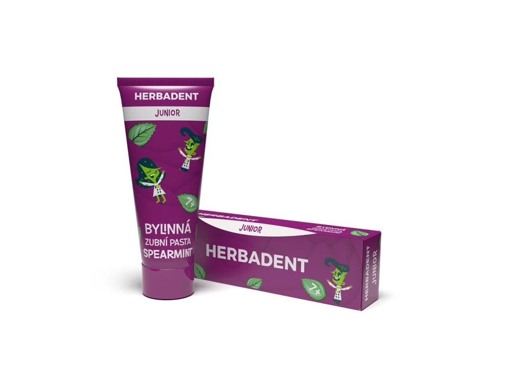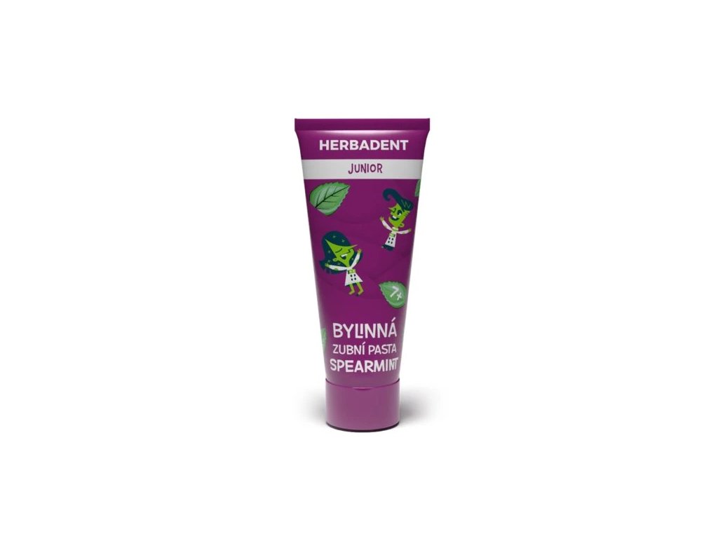 HERBADENT JUNIOR SPEARMINT je jemná zubní pasta pro děti od 7 let. Obsahuje extrakt ze 7 léčivých bylin a 1450 ppm fluoridů, které posilují zubní sklovinu a chrání před kazem.