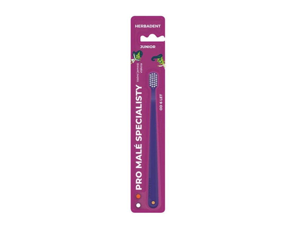 HERBADENT JUNIOR zubní kartáček s velmi jemnými vlákny – fialový – dětský zubní kartáček s velmi jemnými vlákny a zmenšenou hlavicí pro šetrné a důkladné čištění dětských zubů. Vyvinut ve spolupráci s českými stomatology.