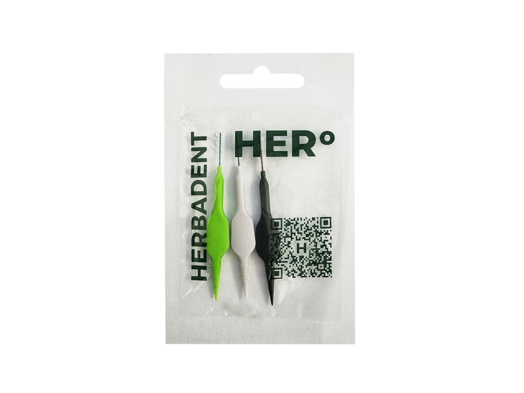 Herbai HERBADENT HERo mezizubní kartáčky testovací sada obsahuje 3 ks kartáčků různých velikostí (S, M, L) pro vyzkoušení vhodné velikosti pro vaše mezizubní prostory. Každý kartáček kombinuje kvalitní vlákna pro efektivní čištění a silikonové párátko pro odstranění větších zbytků jídla.