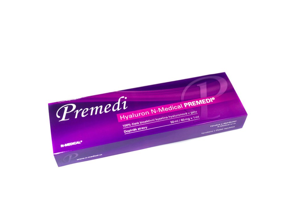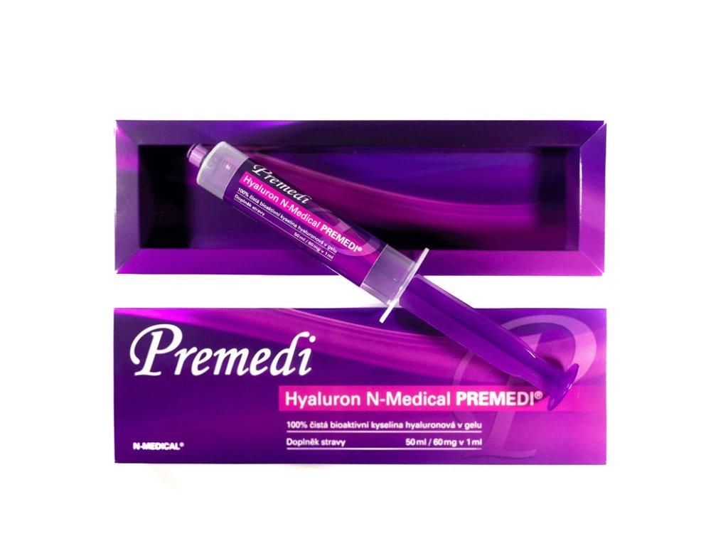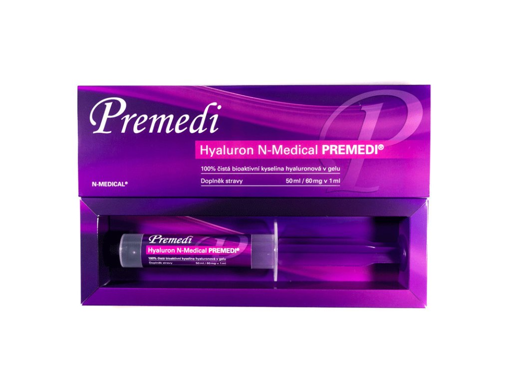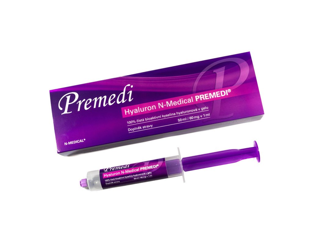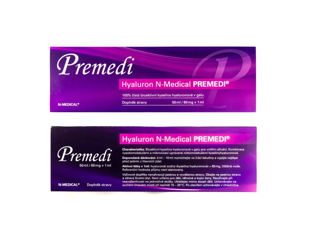 Hyaluron N-Medical PREMEDI je první originální produkt ve formě hydrofilního gelu pro vnitřní užívání. Produkt je vyroben pro pacientky klinik estetické medicíny a korektivní dermatologie. Přípravek je určen pro vnitřní užívání před mini invazivními a invazivními zákroky.