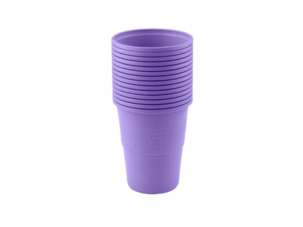 Jednorázové plastové kelímky v levandulové barvě, objem 200 ml, vhodné pro použití v ordinacích, čekárnách i domácnosti.