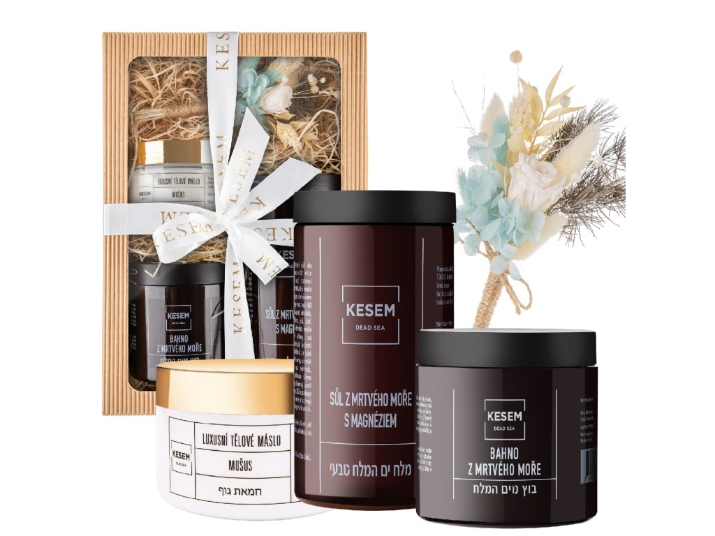 V tomto balíčku se nachází ikonické produkty Kosmetiky KESEM. Sůl z Mrtvého moře je desetkrát více koncentrovaná než klasická mořská sůl. Obsahuje jedinečné minerály, které mají pro tělo blahodárné účinky. Bahno z Mrtvého moře je stejně jako Sůl jedinečné a má řadu léčivých účinků. V balíčku také naleznete velmi oblíbené Tělové máslo, které je bohaté na minerály, přírodní oleje a vitamíny. Vůně mošus je bestsellerem Kosmetiky KESEM, jemná svěží vůně potěší každého. V balíčku také naleznete stabilizovanou květinu od návrhářky Flowers by Helen. Květina vydrží vypadat skvěle minimálně po dobu jednoho roku, nevyžaduje žádnou péči a je skvělým doplňkem do jakékoliv místnosti. Barva květiny v balíčku se může lišit, fotografie je pouze ilustrační.