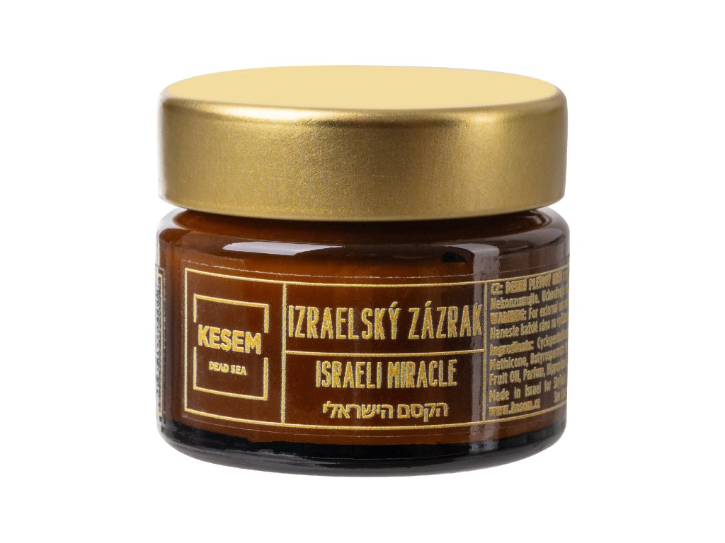 Pleťový denní krém Izraelský zázrak je vytvořen speciálně pro Kosmetiku KESEM. Krém vyrábí přední izraelský chemik pro svoji manželku, který do krému přidává ty nejúčinnější ingredience, které uchovávají pleť stále mladou. Izraelský zázrak poznáte nejen díky jeho výjimečné jemné vůni, ale především dle jeho struktury, která Vám po nanesení připomene ten nejjemnější hedvábný dotek.