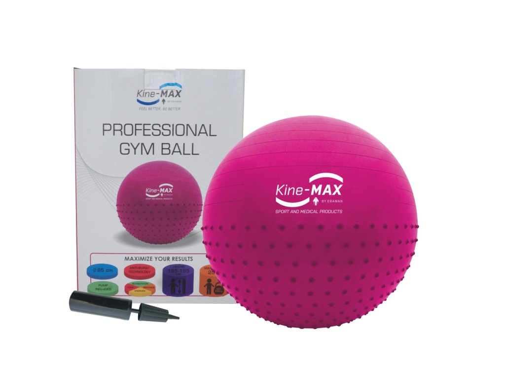 Kine-MAX GYM BALL je profesionálním pomocníkem pro kondiční cvičení, posilovací cvičení, jógu a rehabilitaci. Míč je z jedné poloviny opatřen masážními/reflexními výstupky. Míč je vyroben z vysoce kvalitních a odolných materiálů, využívá technologii ANTI-BURST a je protiskluzový. Maximální zatížení míče je 250Kg. Je vhodný pro všechny uživatele do výšky 185 cm. Míč je dodáván s kvalitní pumpičkou pro snadné nafouknutí. Kine-MAX GYM BALL je ideálním pomocníkem pro udržení zdravé fyzické kondice.