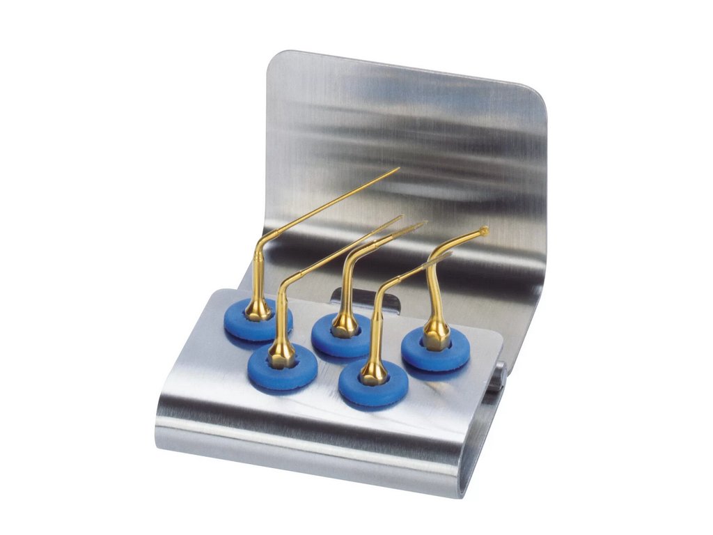 Kit Endo revize – kompletní sada pro revizní endodontické ošetření, obsahuje koncovky ER1, ER2, ER3, ER4, ER5 pro lokalizaci a zpřístupnění kalcifikovaných vstupů, odstranění výplňových materiálů, kořenových elementů a zlomených vložek v různých úsecích kořenového kanálku.