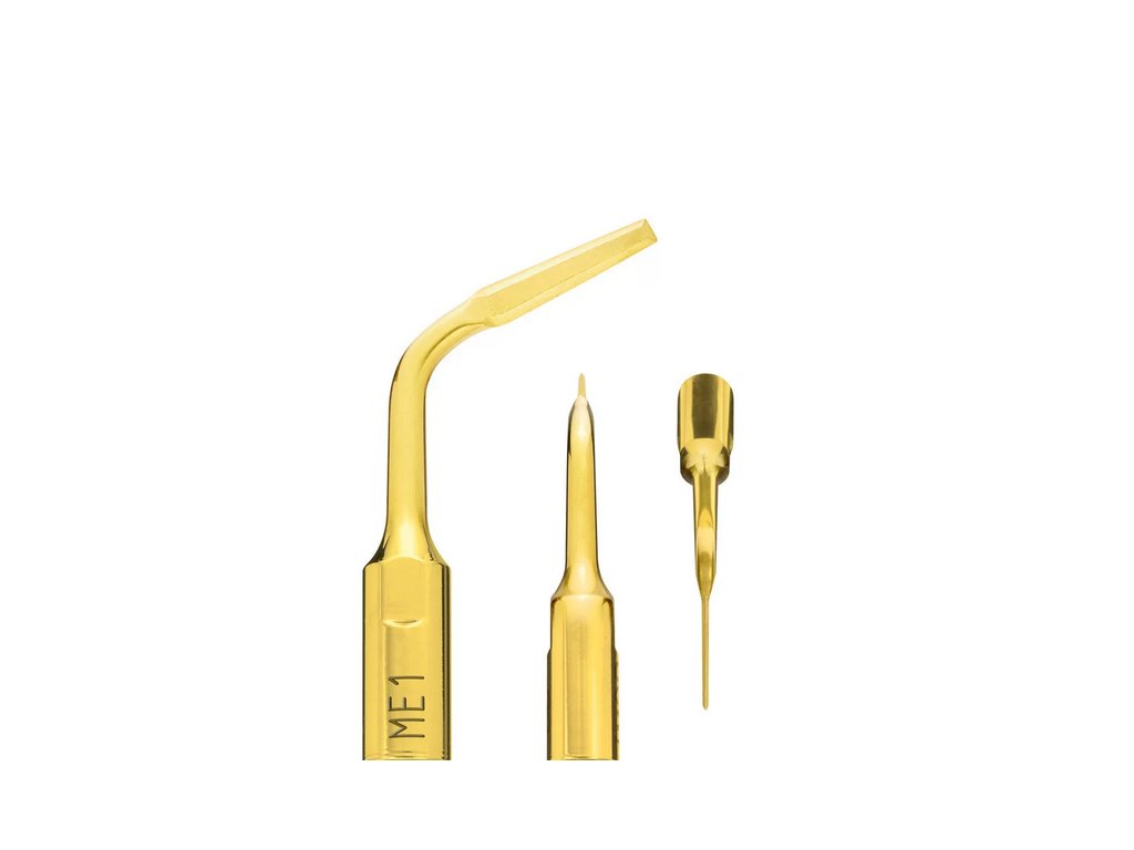 ME1 – speciálně tvarovaná koncovka pro extrakce s oboustranným ostřím o tloušťce pouhých 0,35 mm, určená pro atraumatické odstranění zubů. Povrch opatřen povlakem z nitridu titanu. Destička je určena výhradně pro PULSNÍ REŽIM přístrojů multipiezo pro a multipiezo. Referenční číslo: 03130001-001.