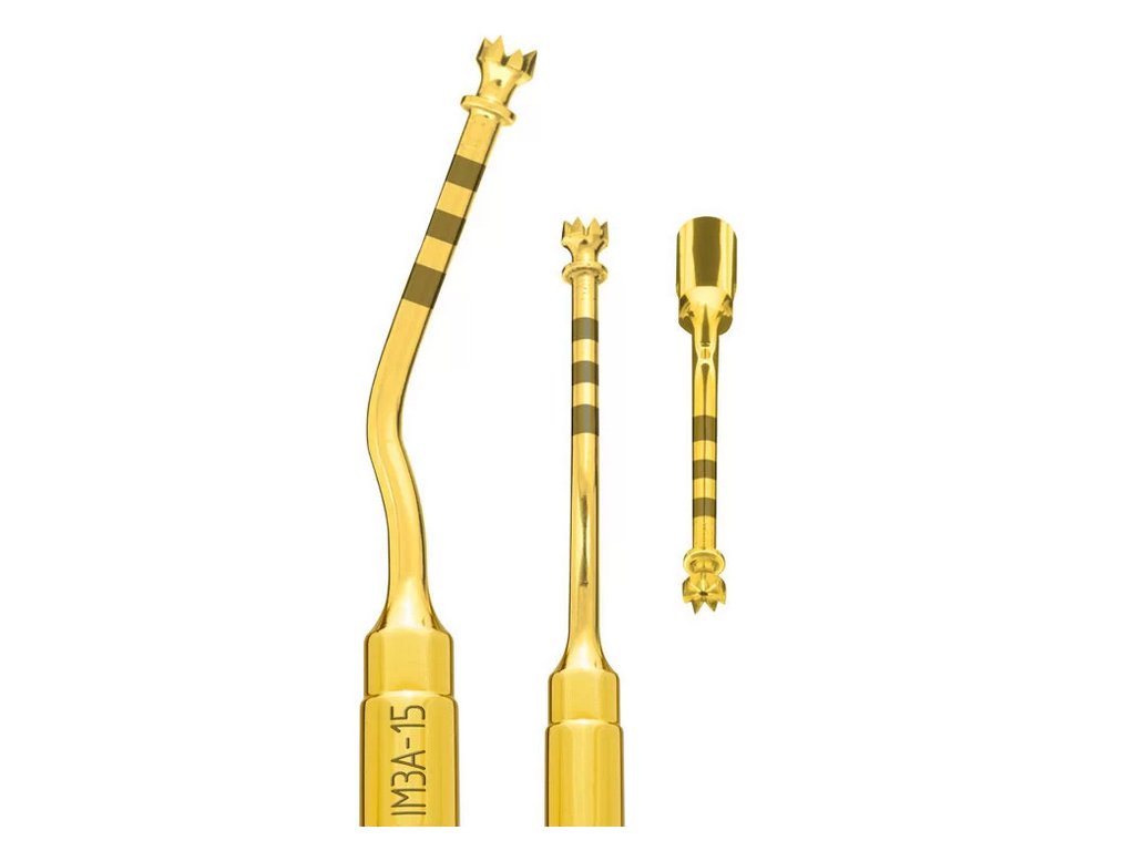 Vložka IM3A-15 pro zvětšení nebo dokončení osteotomie v přední oblasti horní čelisti. Průměr 3 mm, délka 15 mm, nitrid titanu pro vyšší odolnost, určena pro použití s dvojitou irigací k prevenci přehřátí kosti.