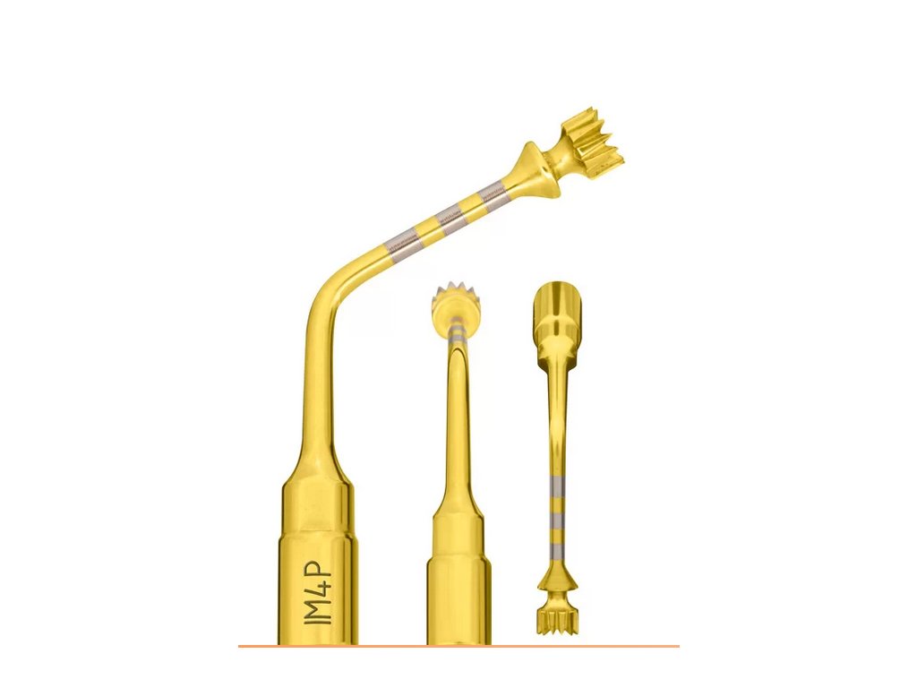 Vložka IM4P určená pro dokončení implantátního lože v zadní oblasti horní čelisti. Průměr 4 mm, délka 15 mm, s nitrid titanu povrchem, navržena pro použití s dvojitou irigací k ochraně kosti před přehřátím.
