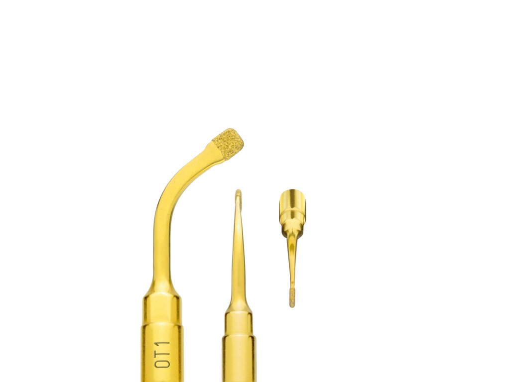 OT1 je koncovka pro mikrometrickou osteotomii (cca 1 mm) s povrchem z nitridu titanu a diamantovými zrny (91 µm). Určena k preciznímu dokončení osteotomie v blízkosti měkkých tkání, jako je sinusová membrána či alveolární nerv.
