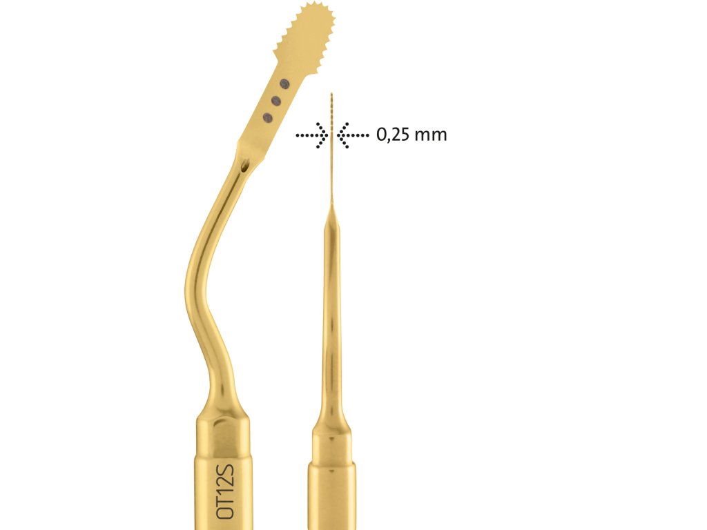 Koncovka OT12S je kotoučová mikropila o tloušťce pouhých 0,25 mm, určená pro velmi jemnou osteotomii v klinických situacích, kde je omezený přístup a standardní piezoelektrické pily nejsou vhodné. Nabízí maximální přesnost a kontrolu, například při rozšiřování alveolárního hřebene nebo odebírání kostních bloků.