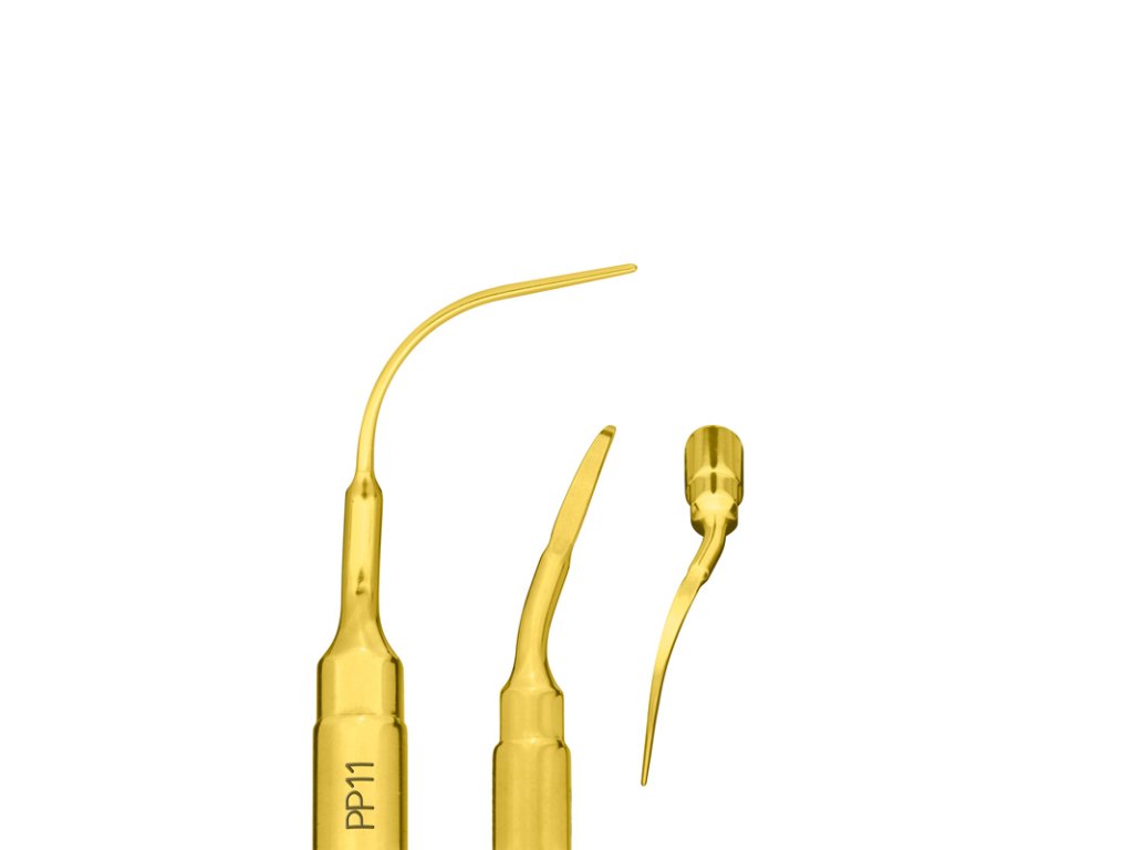 PP11 je pravoúhlá perioanatomická vložka určená k mikrovyhlazení povrchu kořene a šetrnému odstranění subgingiválních konkrementů. S povlakem z nitridu titanu je ideální pro precizní práci při periodontální chirurgii.