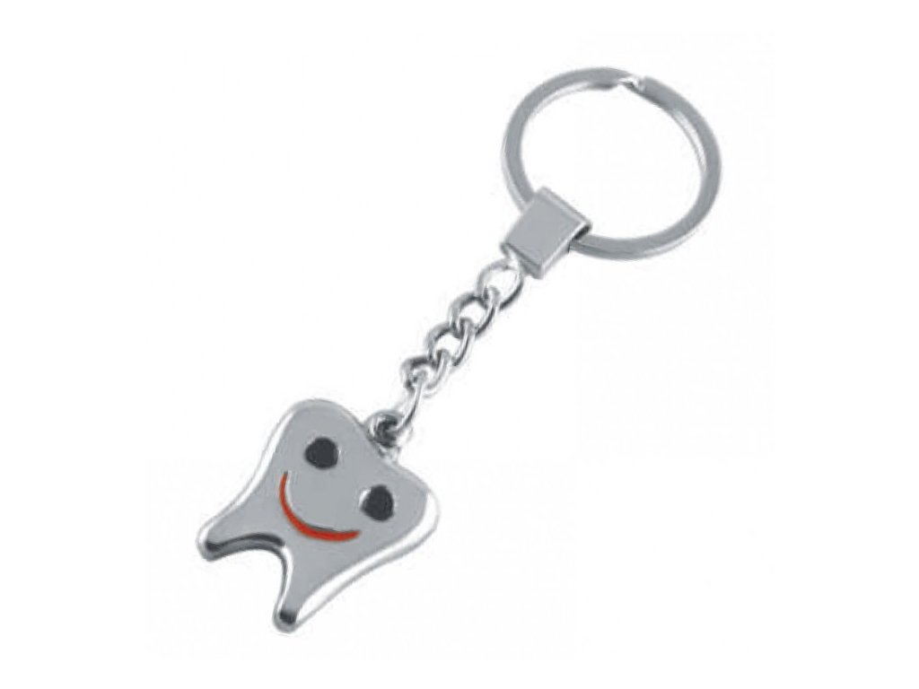 Originální kovový přívěsek na klíče ve tvaru zubu s úsměvem. Ideální jako dárek pro zubaře, studenty stomatologie nebo každého, kdo se rád usmívá – a má blízko ke zdravému chrupu.