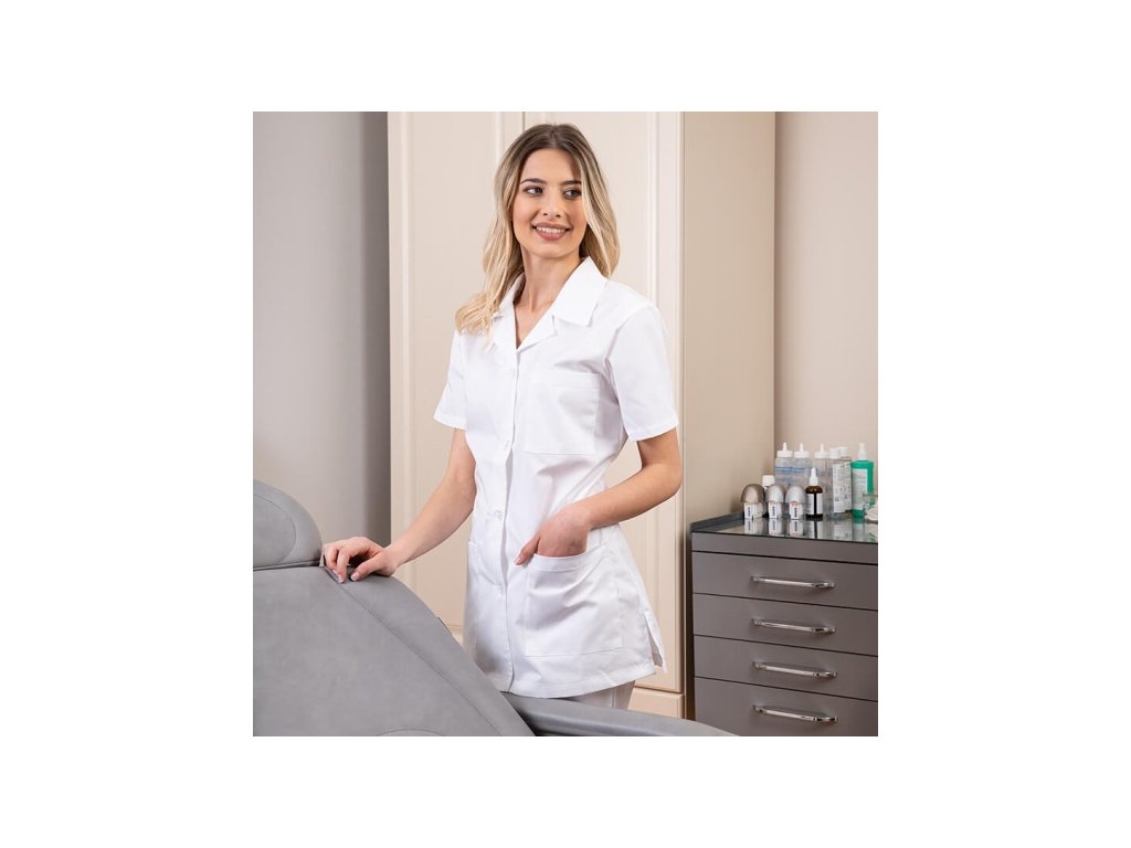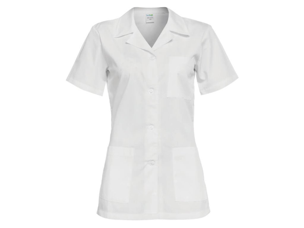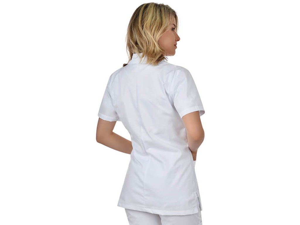 Tato dámská lékařská košile v bílé barvě je ideální volbou pro zdravotnický personál, který potřebuje pohodlné a praktické pracovní oblečení. Je vyrobena z kvalitní směsi polyesteru (65%) a bavlny (35%), což zaručuje pohodlí i snadnou údržbu. Košile má krátké rukávy, praktické rozparky na bocích a několik kapes, včetně jedné náprsní, což ji činí ideální pro každodenní pracovní činnosti.