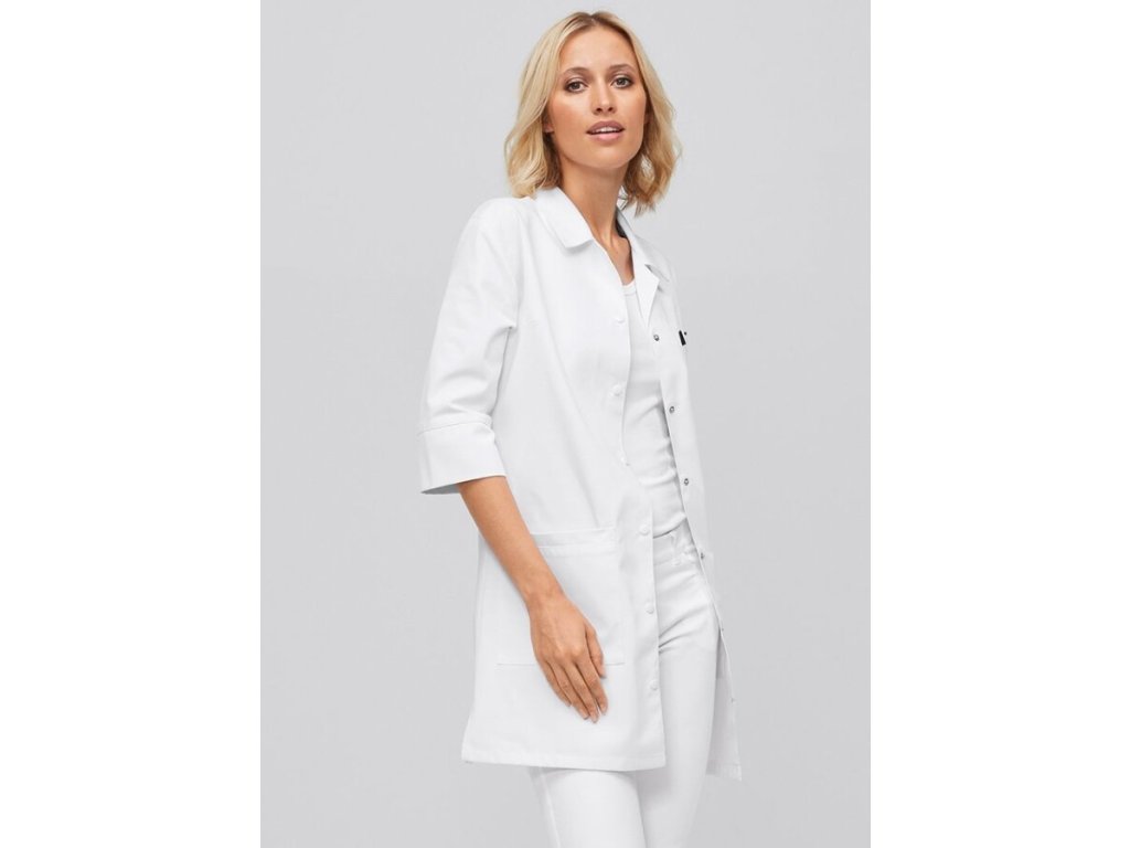 - Střih: Elegantní a kratší, ideální pro ženy, které hledají moderní pracovní plášť.