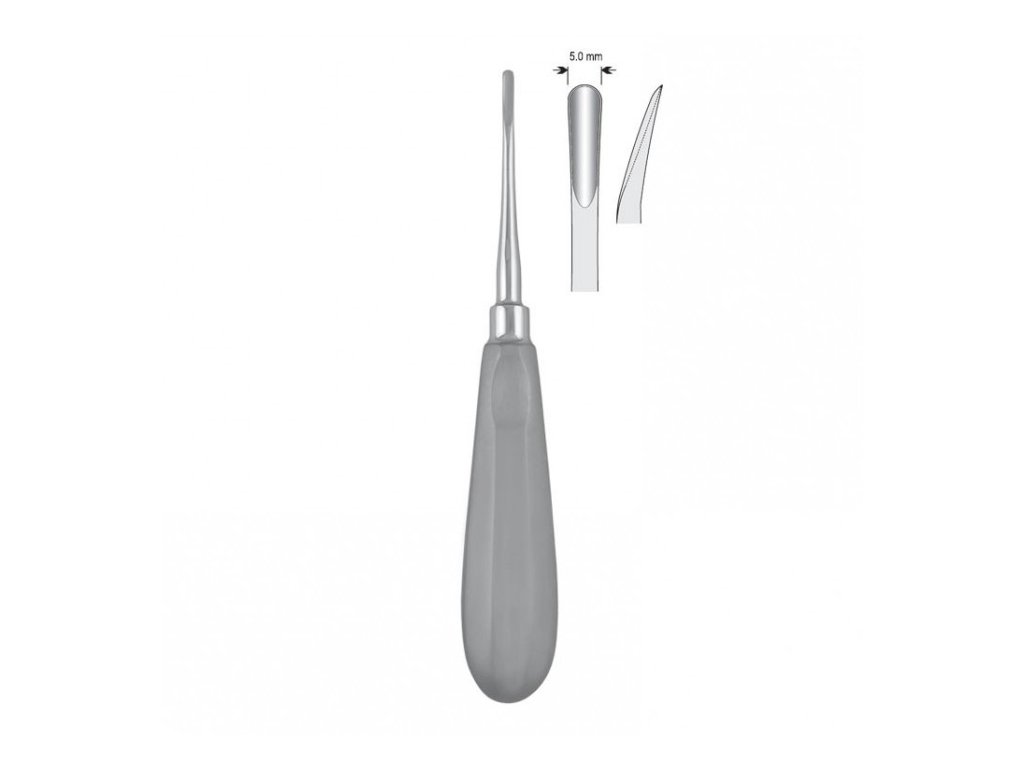 Luxátor fig. 5 se zakřivenou 5mm čepelí je určen pro atraumatické extrakce zubů. Jeho tvar umožňuje snadnější přístup do distálních a těžko dostupných oblastí ústní dutiny, především u molárů. Minimalizuje poškození alveolární kosti a přilehlých tkání, čímž napomáhá k rychlejší rekonvalescenci. Ergonomická rukojeť zajišťuje pevný úchop a přesné vedení nástroje.