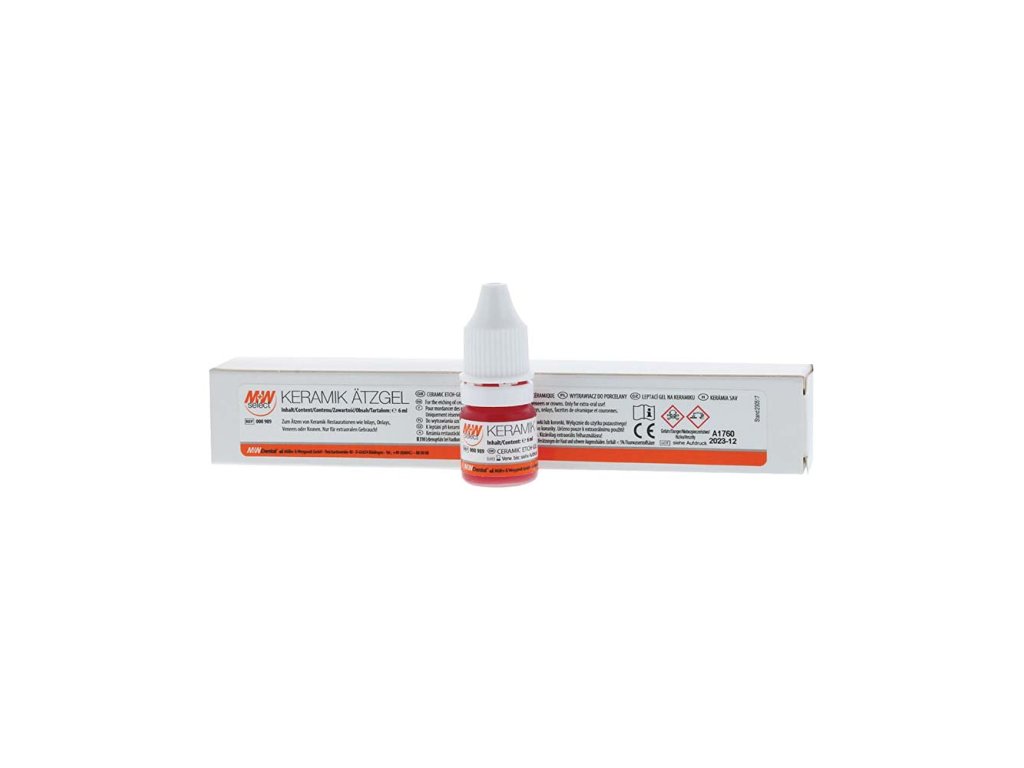 5% kyselina fluorovodíková (HF) na leptání keramických náhrad. Vazba mezi povrchem keramiky a fixačními kompozity se zvýší vytvořením retenčního naleptaného povrchu. Optimální gelovitá konzistence umožňuje snadnou a přesnou aplikaci. Obsah: 1x6ml lahvička.