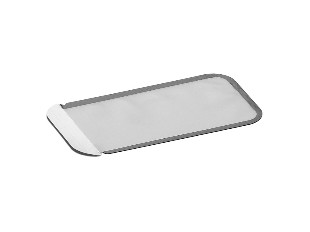 - Konstrukce: Tear-away otvor s vybráním pro palec, zaoblené rohy
